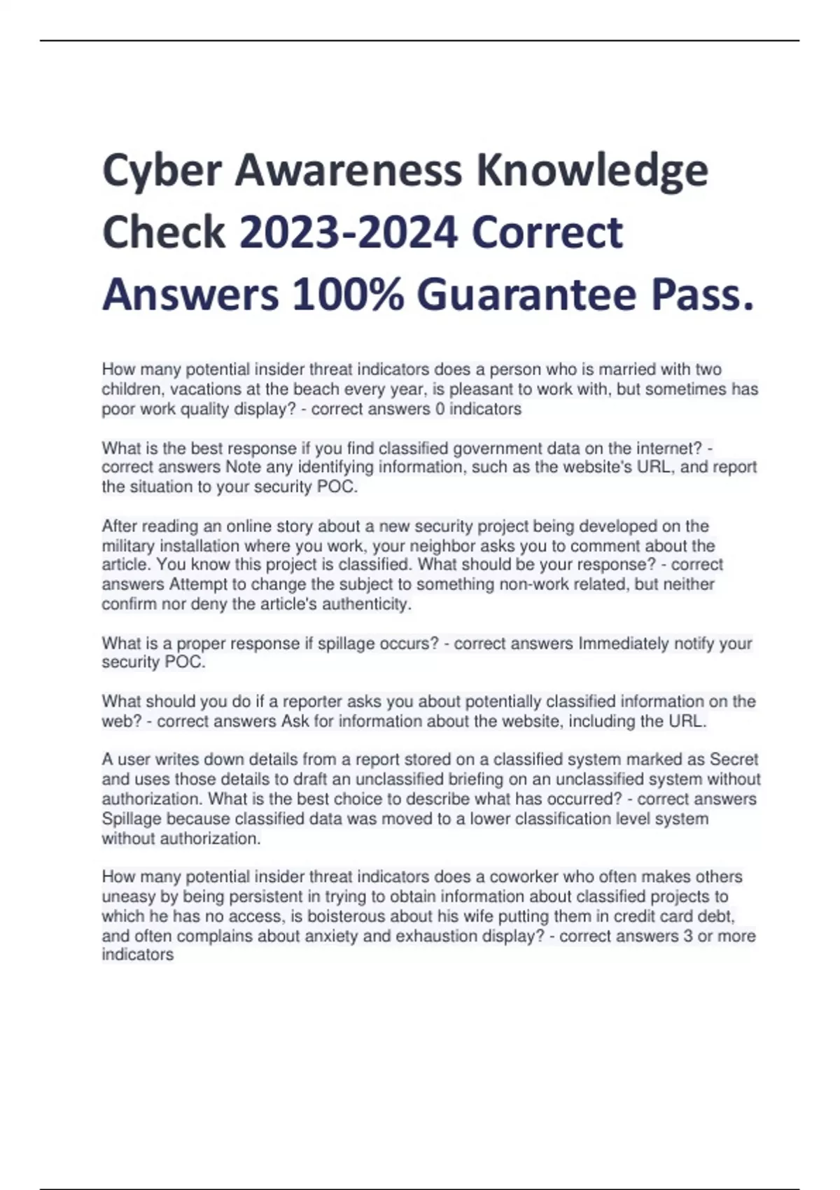 Cyber Awareness Knowledge Check Correct Answers 100% Guarantee Pass. How many potential insider threat indicators does a person who is married with two children, vacations at the beach every year, is pleasant to work with, but sometimes has poor work quality display? - correct answers 0 indicators What is the best response if you find classified government data on the internet? - correct answers Note any identifying information, such as the website's URL, and report the situation to your security POC. After reading an online story about a new security project being developed on the military installation where you work, your neighbor asks you to comment about the article. You know this project is classified. What should be your response? - correct answers Attempt to change the subject to something non-work related, but neither confirm nor deny the article's authenticity. What is a proper response if spillage occurs? - correct answers Immediately notify your security POC. What should you do if a reporter asks you about potentially classified information on the web? - correct answers Ask for information about the website, including the URL. A user writes down details from a report stored on a classified system marked as Secret and uses those details to draft an unclassified briefing on an unclassified system without authorization. What is the best choice to describe what has occurred? - correct answers Spillage because classified data was moved to a lower classification level system without authorization. How many potential insider threat indicators does a coworker who often makes others uneasy by being persistent in trying to obtain information about classified projects to which he has no access, is boisterous about his wife putting them in credit card debt, and often complains about anxiety and exhaustion display? - correct answers 3 or more indicators Which of the following can an unauthorized disclosure of information classified as Confidential reasonably be expected to cause? - correct answers Damage to national security Which classification level is given to information that could reasonably be expected to cause serious damage to national security? - correct answers Secret When classified data is not in use, how can you protect it? - correct answers Store classified data appropriately in a GSA-approved vault/container when not in use. Which is a good practice to protect classified information? - correct answers Ensure proper labeling by appropriately marking all classified material and, when required, sensitive material. Which of the following is a good practice to aid in preventing spillage? - correct answers Be aware of classification markings and all handling caveats. What is required for an individual to access classified data? - correct answers Appropriate clearance; signed and approved non-disclosure agreement; and need-toknow. What type of activity or behavior should be reported as a potential insider threat? - correct answers Coworker making consistent statements indicative of hostility or anger toward the United States and its policies. Which of the following practices reduces the chance of becoming a target by adversaries seeking insider information? - correct answers Don't talk about work outside your workspace unless it is a specifically designated public meeting environment and is controlled by the event planners. Which scenario might indicate a reportable insider threat security incident? - correct answers A coworker is observed using a personal electronic device in an area where their use is prohibited. Why might "insiders" be able to cause damage to their organizations more easily than others? - correct answers Insiders are given a level of trust and have authorized access to Government information systems. Which of the following is a best practice to protect information about you and your organization on social networking sites and applications? - correct answers Use only personal contact information when establishing personal social networking accounts, never use Government contact information. What should you do if an individual asks you to let her follow you into your controlled space, stating that she left her security badge at her desk? - correct answers Don't allow her access into secure areas and report suspicious activity. Which represents a security best practice when using social networking? - correct answers Understanding and using available privacy settings. Which is NOT a sufficient way to protect your identity? - correct answers Use a common password for all your system and application logons. Under which circumstances may you be subject to criminal, disciplinary, and/or administrative action due to online misconduct? - correct answers Any time you participate in or condone misconduct, whether offline or online. As someone who works with classified information, what should you do if you are contacted by a foreign national seeking information on a research project? - correct answers Inform your security POC of all non-professional or non-routine contacts with foreign nations, including, but not limited to, joining each other's social media sites. Which of the following is true about unclassified data? - correct answers When unclassified data is aggregated, its classification level may rise. What are some potential insider threat indicators? - correct answers Difficult life circumstances such as substance abuse; divided loyalty or allegiance to the U.S.; or extreme, persistent interpersonal difficulties. What information posted publicly on your personal social networking profile represents a security risk? - correct answers Your place of birth What is an individual's Personally Identifiable Information (PII) or Protected Health Information (PHI) considered? - correct answers Sensitive information. Under what circumstances could unclassified information be considered a threat to national security? - correct answers If aggregated, the information could becom