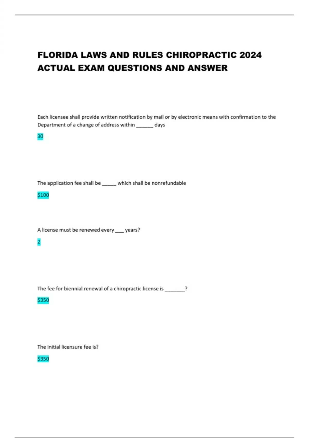 FLORIDA LAWS AND RULES CHIROPRACTIC 2024 ACTUAL EXAM QUESTIONS AND ANSWER