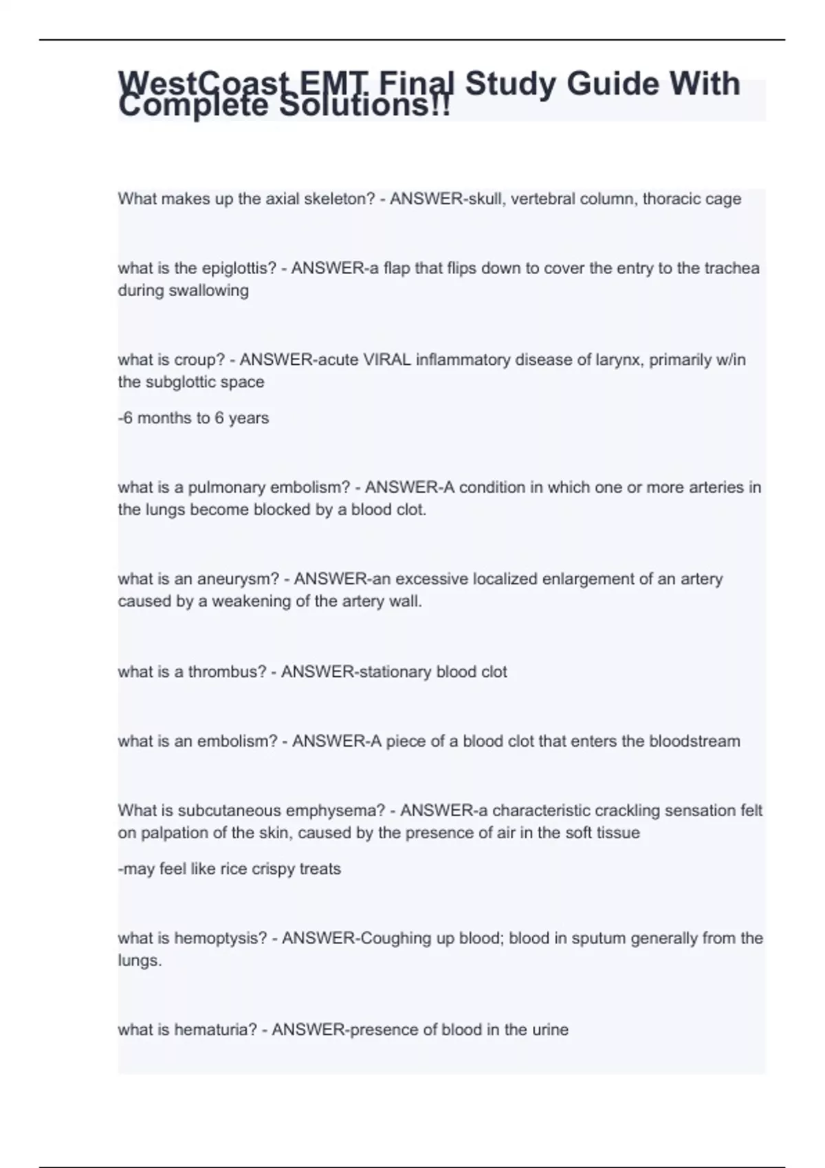 what is the epiglottis? - ANSWER-a flap that flips down to cover the entry to the trachea during swallowing what is croup? - ANSWER-acute VIRAL inflammatory disease of larynx, primarily w/in the subglottic space -6 months to 6 years what is a pulmonary embolism? - ANSWER-A condition in which one or more arteries in the lungs become blocked by a blood clot. what is an aneurysm? - ANSWER-an excessive localized enlargement of an artery caused by a weakening of the artery wall. what is a thrombus? - ANSWER-stationary blood clot what is an embolism? - ANSWER-A piece of a blood clot that enters the bloodstream What is subcutaneous emphysema? - ANSWER-a characteristic crackling sensation felt on palpation of the skin, caused by the presence of air in the soft tissue -may feel like rice crispy treats what is hemoptysis? - ANSWER-Coughing up blood; blood in sputum generally from the lungs. what is hematuria? - ANSWER-presence of blood in the urine What is hematemesis? - ANSWER-vomiting blood What is capnography? - ANSWER-A noninvasive technique to alert you to hypoventilation even when your patient's pulse ox reading are fine. Carbon dioxide is the most significant factor in monitoring ventilation. Capnography measures the CO2 in every breath to monitor air exchange in the patient's alveoli.