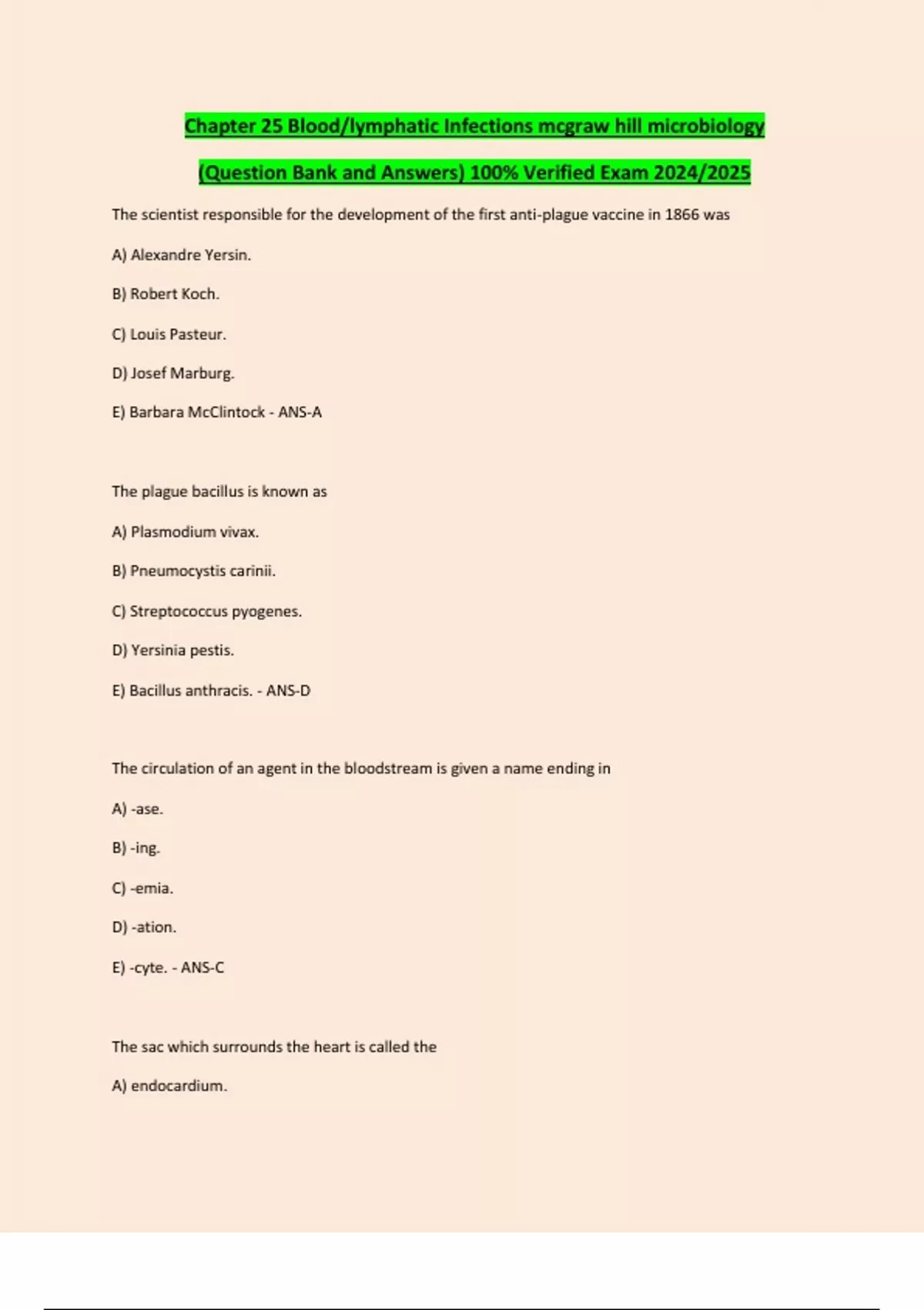 Chapter 25 Blood/lymphatic Infections mcgraw hill microbiology (Question Bank and Answers) 100% Verified Exam 2024/2025 The scientist responsible for the development of the first anti-plague vaccine in 1866 was A) Alexandre Yersin. B) Robert Koch. C) Louis Pasteur. D) Josef Marburg. E) Barbara McClintock - ANS-A The plague bacillus is known as A) Plasmodium vivax. B) Pneumocystis carinii. C) Streptococcus pyogenes. D) Yersinia pestis. E) Bacillus anthracis. - ANS-D The circulation of an agent in the bloodstream is given a name ending in A) -ase. B) -ing. C) -emia. D) -ation. E) -cyte. - ANS-C The sac which surrounds the heart is called the A) endocardium. B) pericardium. C) atrium. D) myocardium. E) endothelium. - ANS-B The heart chamber that passes blood to the lungs is the A) left ventricle. B) right ventricle. C) right atrium. D) left atrium. E) right ventricle AND left atrium. - ANS-B Which organism may be implicated in atherosclerosis? A) Escherichia coli B) Pseudomonas aeruginosa C) Staphylococcus aureus D) Chlamydophila pneumoniae E) Mycoplasma pneumoniae - ANS-D The fluid which bathes and nourishes the tissue cells is the Continues...