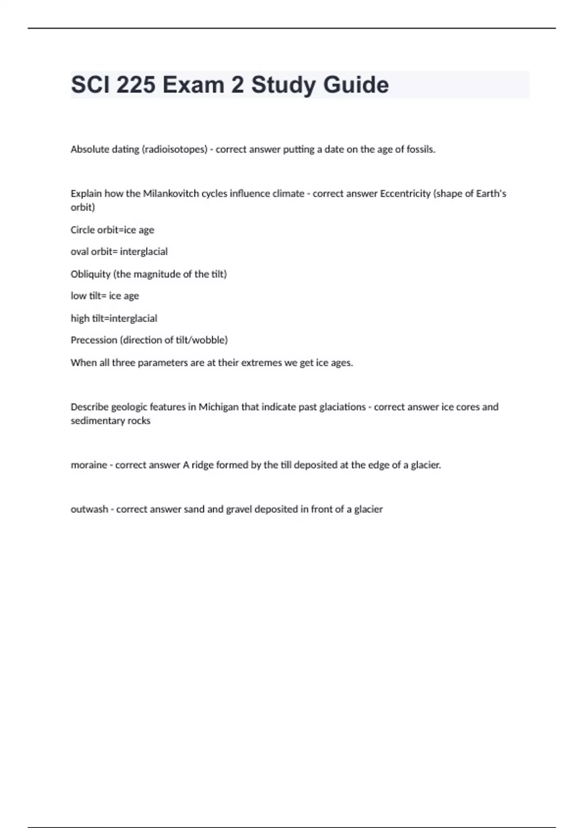 SCI 225 Exam 2 Study GuideAbsolute dating (radioisotopes) - correct answer putting a date on the age of fossils. Explain how the Milankovitch cycles influence climate - correct answer Eccentricity (shape of Earth's orbit) Circle orbit=ice age oval orbit= interglacial Obliquity (the magnitude of the tilt) low tilt= ice age high tilt=interglacial Precession (direction of tilt/wobble) When all three parameters are at their extremes we get ice ages. Describe geologic features in Michigan that indicate past glaciations - correct answer ice cores and sedimentary rocks moraine - correct answer A ridge formed by the till deposited at the edge of a glacier. outwash - correct answer sand and gravel deposited in front of a glacier