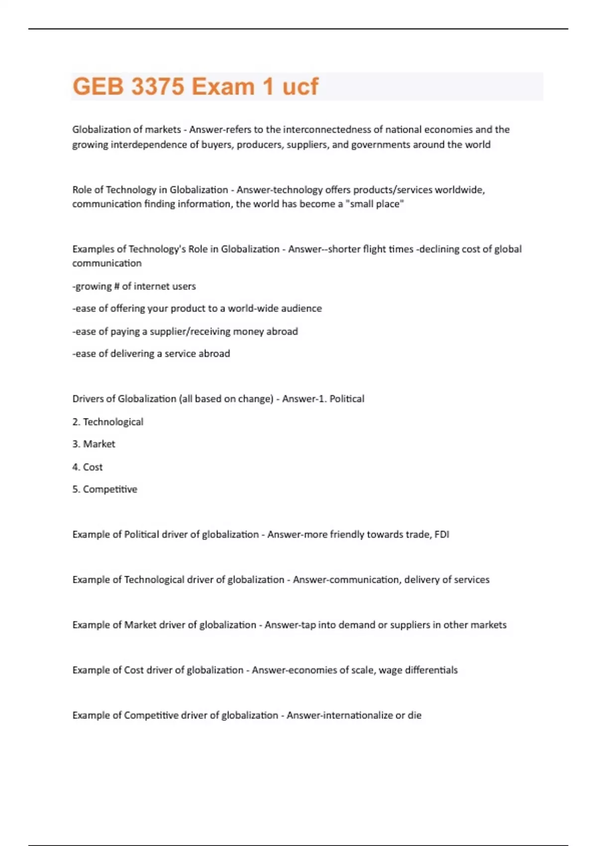 Globalization of markets - Answer-refers to the interconnectedness of national economies and the growing interdependence of buyers, producers, suppliers, and governments around the world Role of Technology in Globalization - Answer-technology offers products/services worldwide, communication finding information, the world has become a "small place" Examples of Technology's Role in Globalization - Answer--shorter flight times -declining cost of global communication -growing # of internet users -ease of offering your product to a world-wide audience -ease of paying a supplier/receiving money abroad -ease of delivering a service abroad Drivers of Globalization (all based on change) - Answer-1. Political 2. Technological 3. Market 4. Cost 5. Competitive Example of Political driver of globalization - Answer-more friendly towards trade, FDI Example of Technological driver of globalization - Answer-communication, delivery of services Example of Market driver of globalization - Answer-tap into demand or suppliers in other markets Example of Cost driver of globalization - Answer-economies of scale, wage differentials Example of Competitive driver of globalization - Answer-internationalize or dieIs the idea of doing business internationally new? - Answer-Of course not Importing - Answer-the transportation of any good or service into a country or region from a foreign origination point Arguments against globalization - Answer-1. it has produced uneven results across nations and people 2. deleterious effects on labor and labor standards 3. decline in environmental and health conditions Top 3 largest trading nations - Answer-1. China 2. United States 3. Germany Major trading partners of the U.S. - Answer-1. China 2. Canada 3. Mexico 2013 largest markets for american exports - Answer-about 1/2 went to other nations in North America Trade balance - Answer-value of imports = value of exports Trade surplus - Answer-the amount by which the value of a national exports exceeds the value of its imports Trade deficit - Answer-the amount by which the value of imports into a nation exceeds the value of its exports Economies of scale - Answer-the predictable decline in the average cost of producing each unit of output as a production facility gets larger and output increases (also works for services)Experience curve - Answer-the rising scale on which efficiency improves as a result of cumulative experience and learning (works for manufacturing and services) What do the concepts of "economies of scale" and "experience curve" have to do with the issue of international trade? - Answer-because they can permit a nation's industries to become low-cost producers without having an abundance of the resources used as inputs, such as minerals or labor Regionalization of trade - Answer-in many industries firms tend to cluster together on a geographic basis Porter's Diamond model question - Answer-why, in many industries, do firms tend to cluster together on a geographic basis? Porter's Diamond model idea - Answer-the competitiveness (in a particular industry) results from conditions or elements on both the country and the firm level Porter's Diamond model 4 elements - Answer-1. Factor conditions 2. Related and supporting industries 3. Demand conditions 4. Firm strategy, structure, and rivalry National competitiveness - Answer-a nation's relative ability to design, produce, distribute, or service products within an international trading context which earning increasing returns on its resources Countries that receive a lot of FDI - Answer-1. China 2. Hong Kong 3. U.S. 4. UK 5.Singapore Countries that are the source of a lot of FDI - Answer-1. U.S.2. China 3. UK 4. Germany 5. Japan US accumulated FDI investment abroad in which countries - Answer-Canada, Mexico, Europe, Australia Greenfield investment - Answer-the establishment of new facilities from the ground up Portfolio investment - Answer-the purchase of an existing business in another nation Culture (2 definitions) - Answer--the learned, charged, and enduring orientation patterns in society demonstrated through values, ideas, attitudes, behaviors, and symbols -a collective programming of the mind that distinguishes the members of one group or category of people from another Culture (characteristics) - Answer--applies to nationalities as well as sub-cultures (professions) -influences: how people behave, negotiate, communicate, what people buy, food preferences, risk taking, behavior interpretation, expectations