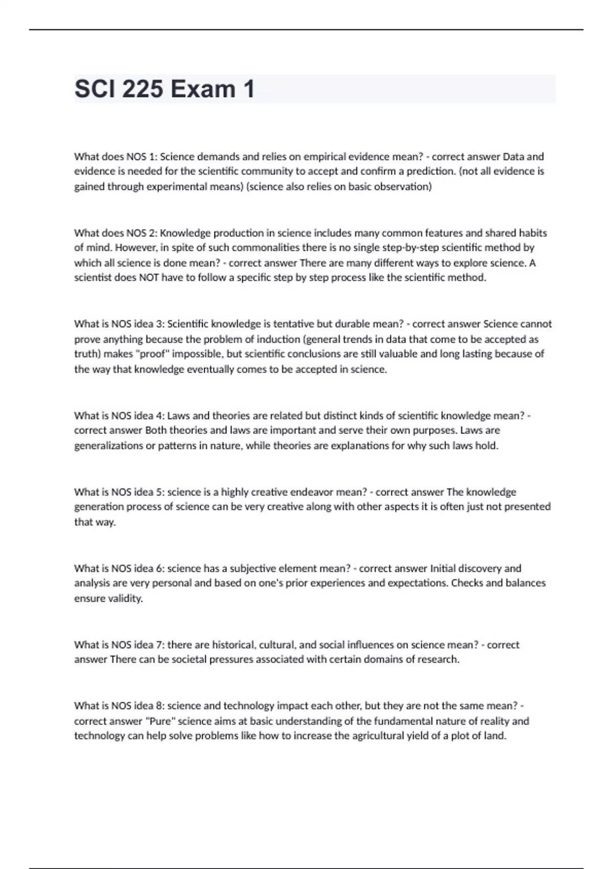 SCI 225 Exam 1What does NOS 1: Science demands and relies on empirical evidence mean? - correct answer Data and evidence is needed for the scientific community to accept and confirm a prediction. (not all evidence is gained through experimental means) (science also relies on basic observation) What does NOS 2: Knowledge production in science includes many common features and shared habits of mind. However, in spite of such commonalities there is no single step-by-step scientific method by which all science is done mean? - correct answer There are many different ways to explore science. A scientist does NOT have to follow a specific step by step process like the scientific method. What is NOS idea 3: Scientific knowledge is tentative but durable mean? - correct answer Science cannot prove anything because the problem of induction (general trends in data that come to be accepted as truth) makes "proof" impossible, but scientific conclusions are still valuable and long lasting because of the way that knowledge eventually comes to be accepted in science. What is NOS idea 4: Laws and theories are related but distinct kinds of scientific knowledge mean? - correct answer Both theories and laws are important and serve their own purposes. Laws are generalizations or patterns in nature, while theories are explanations for why such laws hold. What is NOS idea 5: science is a highly creative endeavor mean? - correct answer The knowledge generation process of science can be very creative along with other aspects it is often just not presented that way. What is NOS idea 6: science has a subjective element mean? - correct answer Initial discovery and analysis are very personal and based on one's prior experiences and expectations. Checks and balances ensure validity. What is NOS idea 7: there are historical, cultural, and social influences on science mean? - correct answer There can be societal pressures associated with certain domains of research. What is NOS idea 8: science and technology impact each other, but they are not the same mean? - correct answer "Pure" science aims at basic understanding of the fundamental nature of reality and technology can help solve problems like how to increase the agricultural yield of a plot of land.