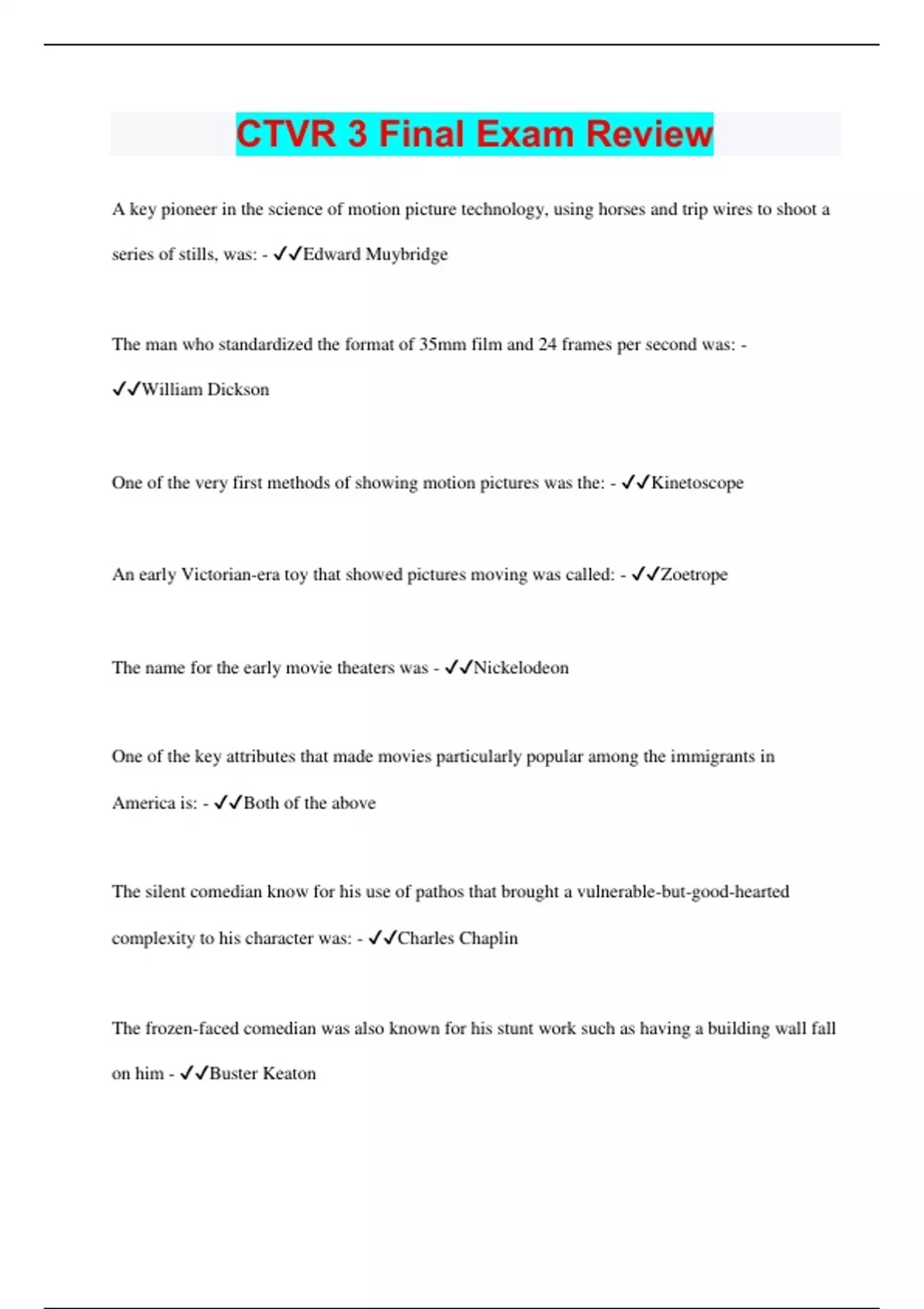 CTVR 3 Final Exam Review A key pioneer in the science of motion picture technology, using horses and trip wires to shoot a series of stills, was: - Edward Muybridge The man who standardized the format of 35mm film and 24 frames per second was: - William Dickson One of the very first methods of showing motion pictures was the: - Kinetoscope An early Victorian-era toy that showed pictures moving was called: - Zoetrope The name for the early movie theaters was - Nickelodeon One of the key attributes that made movies particularly popular among the immigrants in America is: - Both of the above The silent comedian know for his use of pathos that brought a vulnerable-but-good-hearted complexity to his character was: - Charles Chaplin The frozen-faced comedian was also known for his stunt work such as having a building wall fall on him - Buster Keaton The most popular comedian of his era, he was known for his amazing stunt work such as when he dangled out over a 10-story building in the movie Safety Last. - Harold Lloyd Generally considered to be the founding American narrative picture was: - The Great Train Robbery The Director of this film that is considered to be the founding American narrative motion picture is: - Edward Porter Perhaps the first genuinely modern film, utilizing advanced techniques such as cross-cutting, POV and close-up shots, and flashbacks was: - Birth of a Nation The Director of this first genuinely modern film was: - D.W. Griffith A key attribute of the Feature Film is: - All of the above The movement towards naturalistic acting, dream sequences, artistic camera use, and personal action/psychological stories are hallmarks of: - French Impressionism The movement towards distorted and graphic settings, lighting, and art direction along with legendary/supernatural stories is the hallmark of: - German Expressionism The movement towards a high number of shots, faster cutting, and more variety of shots is a hallmark of: - Soviet Montage The trend towards using actual locations, non-actors, regular clothing and props, and more realistic storylines are all attributes of: - Italian Neo-Realism Mise en Scene is: - The arrangement and design of the actors and objects within the picture Hollywood dominates the motion picture industry. One key factor is: - Its penchant for producing tightly structured, clear stories The key difference between surprise and suspense is: - Giving the audience key information The MacGuffin is: - A plot device he