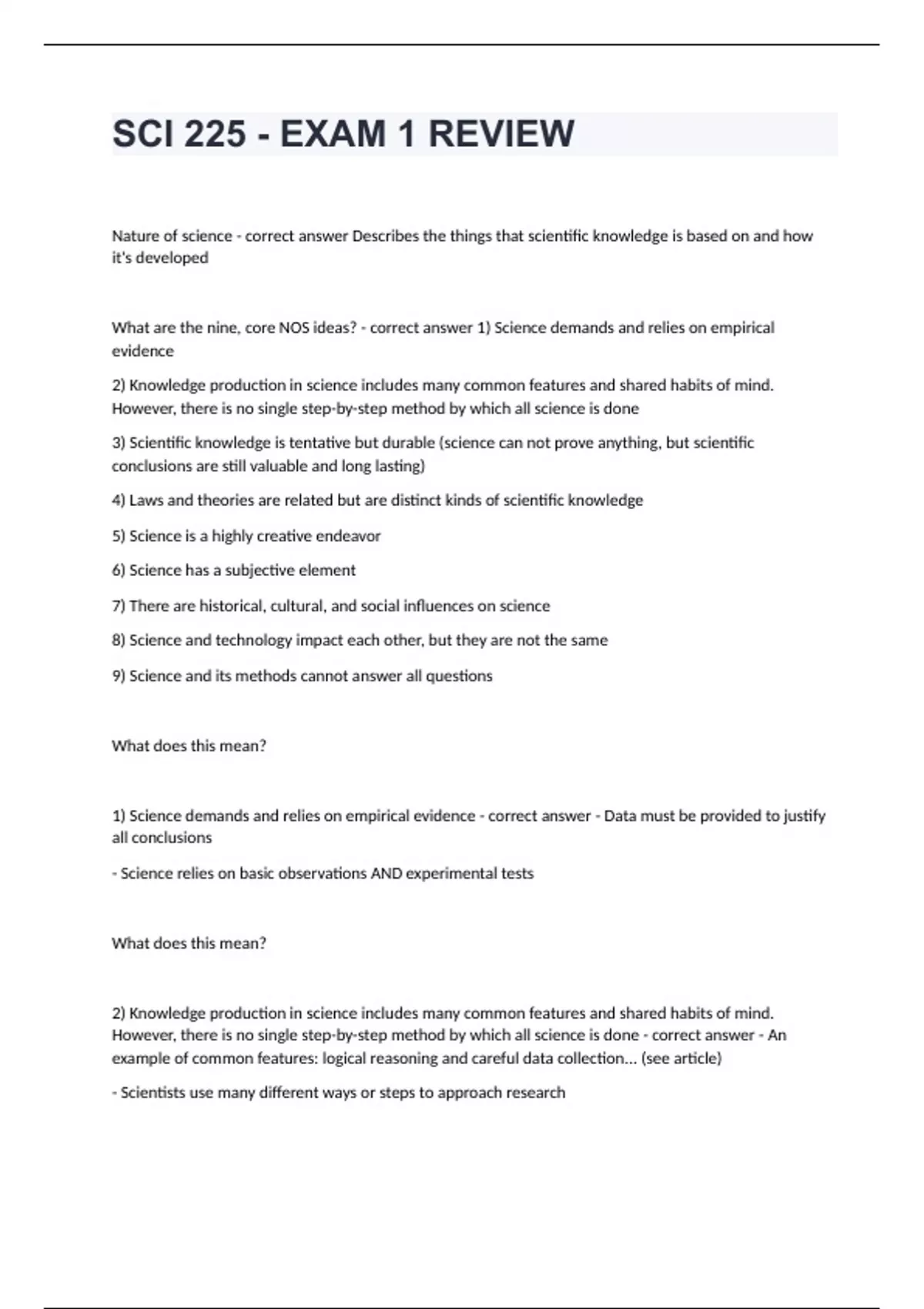 SCI 225 - EXAM 1 REVIEWNature of science - correct answer Describes the things that scientific knowledge is based on and how it's developed What are the nine, core NOS ideas? - correct answer 1) Science demands and relies on empirical evidence 2) Knowledge production in science includes many common features and shared habits of mind. However, there is no single step-by-step method by which all science is done 3) Scientific knowledge is tentative but durable (science can not prove anything, but scientific conclusions are still valuable and long lasting) 4) Laws and theories are related but are distinct kinds of scientific knowledge 5) Science is a highly creative endeavor 6) Science has a subjective element 7) There are historical, cultural, and social influences on science 8) Science and technology impact each other, but they are not the same 9) Science and its methods cannot answer all questions What does this mean? 1) Science demands and relies on empirical evidence - correct answer - Data must be provided to justify all conclusions - Science relies on basic observations AND experimental tests What does this mean? 2) Knowledge production in science includes many common features and shared habits of mind. However, there is no single step-by-step method by which all science is done - correct answer - An example of common features: logical reasoning and careful data collection... (see article) - Scientists use many different ways or steps to approach research