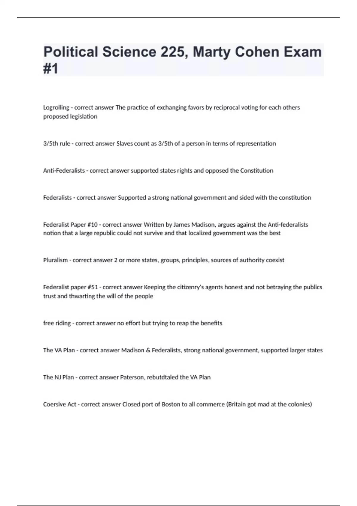 Political Science 225, Marty Cohen Exam #1 Logrolling - correct answer The practice of exchanging favors by reciprocal voting for each others proposed legislation 3/5th rule - correct answer Slaves count as 3/5th of a person in terms of representation Anti-Federalists - correct answer supported states rights and opposed the Constitution Federalists - correct answer Supported a strong national government and sided with the constitution Federalist Paper #10 - correct answer Written by James Madison, argues against the Anti-federalists notion that a large republic could not survive and that localized government was the best Pluralism - correct answer 2 or more states, groups, principles, sources of authority coexist Federalist paper #51 - correct answer Keeping the citizenry's agents honest and not betraying the publics trust and thwarting the will of the people free riding - correct answer no effort but trying to reap the benefits The VA Plan - correct answer Madison & Federalists, strong national government, supported larger states The NJ Plan - correct answer Paterson, rebutdtaled the VA Plan Coersive Act - correct answer Closed port of Boston to all commerce (Britain got mad at the colonies)