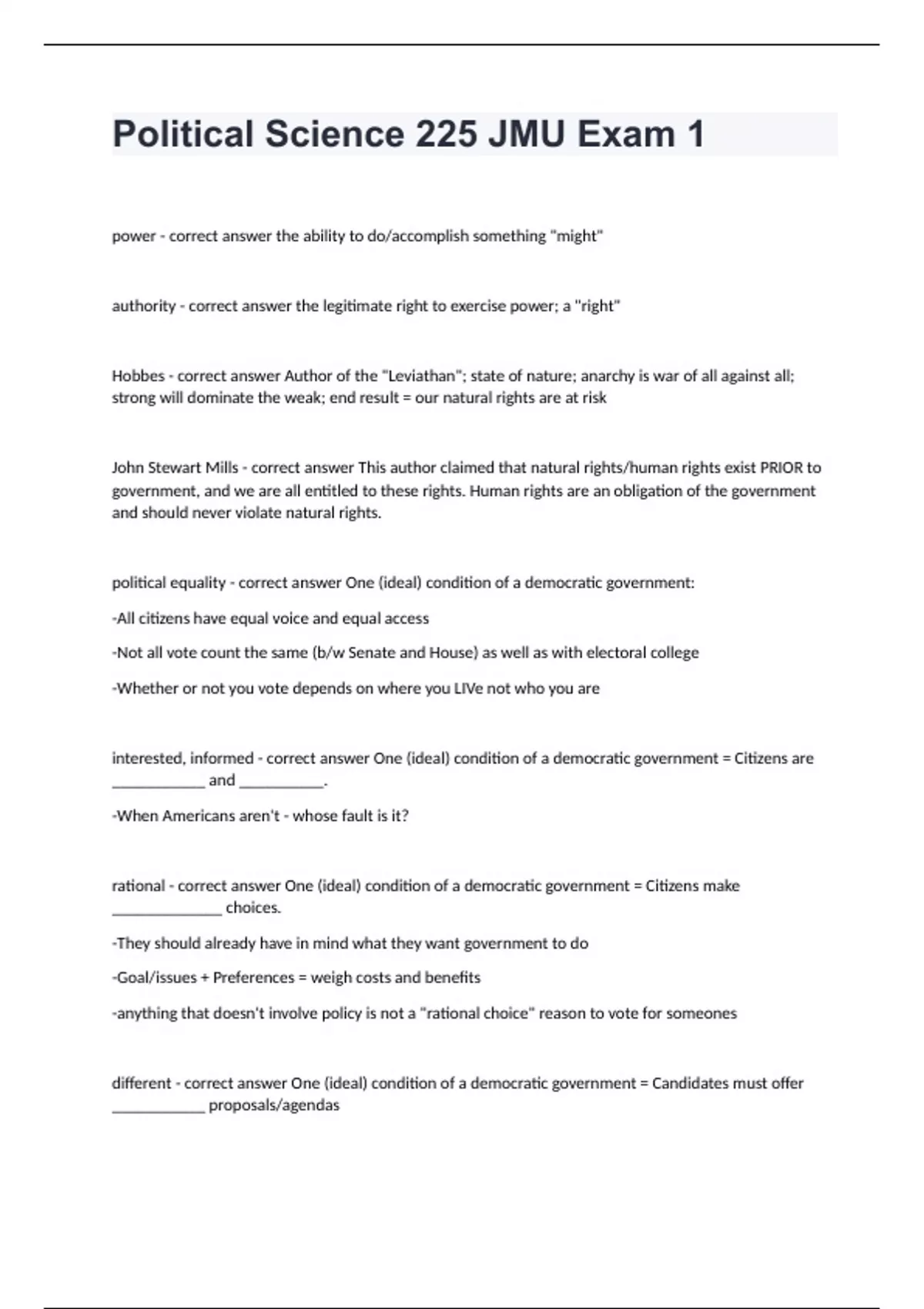 Political Science 225 JMU Exam 1power - correct answer the ability to do/accomplish something "might" authority - correct answer the legitimate right to exercise power; a "right" Hobbes - correct answer Author of the "Leviathan"; state of nature; anarchy is war of all against all; strong will dominate the weak; end result = our natural rights are at risk John Stewart Mills - correct answer This author claimed that natural rights/human rights exist PRIOR to government, and we are all entitled to these rights. Human rights are an obligation of the government and should never violate natural rights. political equality - correct answer One (ideal) condition of a democratic government: -All citizens have equal voice and equal access -Not all vote count the same (b/w Senate and House) as well as with electoral college -Whether or not you vote depends on where you LIVe not who you are interested, informed - correct answer One (ideal) condition of a democratic government = Citizens are ___________ and __________. -When Americans aren't - whose fault is it? rational - correct answer One (ideal) condition of a democratic government = Citizens make _____________ choices. -They should already have in mind what they want government to do -Goal/issues + Preferences = weigh costs and benefits -anything that doesn't involve policy is not a "rational choice" reason to vote for someones different - correct answer One (ideal) condition of a democratic government = Candidates must offer ___________ proposals/agendas