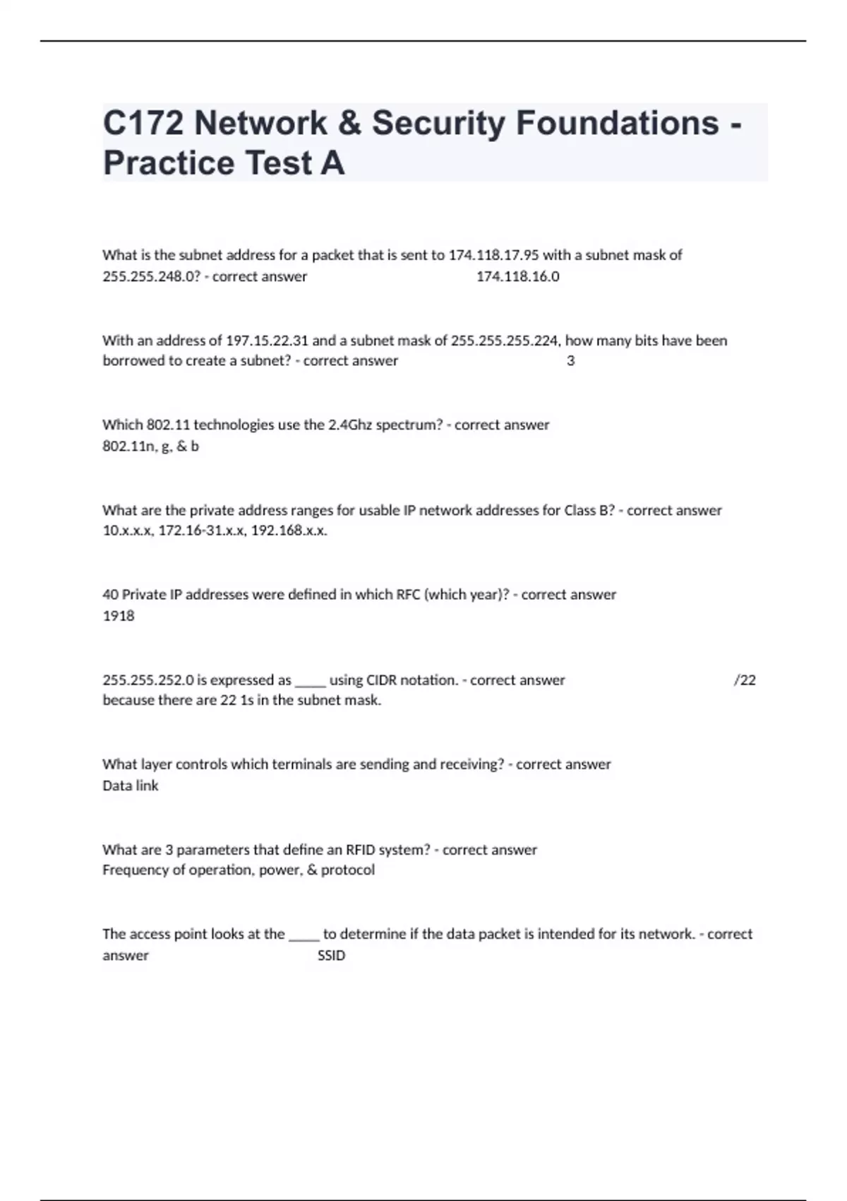 C172 Network & Security Foundations - Practice Test A Questions And Answers Fully SolvedGraded A+.