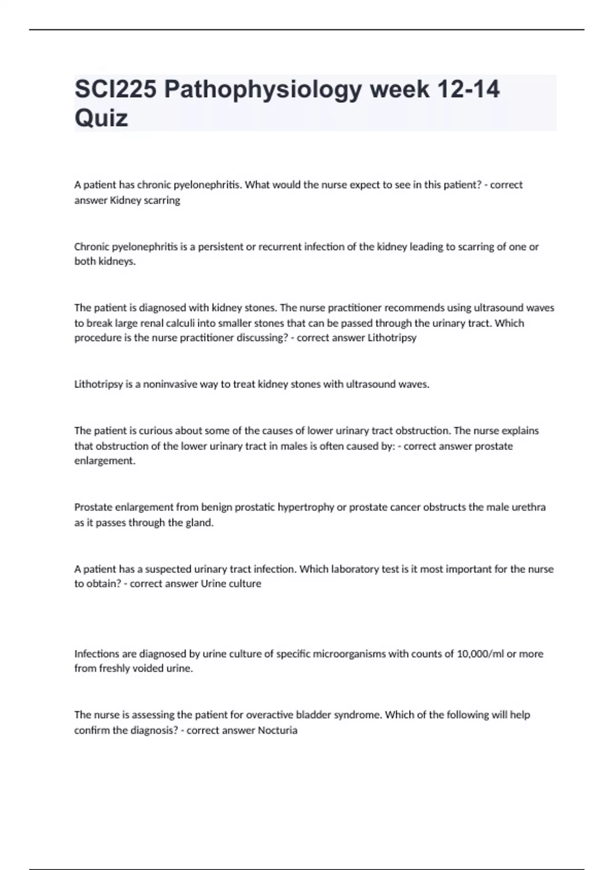 SCI225 Pathophysiology week 12-14 QuizA patient has chronic pyelonephritis. What would the nurse expect to see in this patient? - correct answer Kidney scarring Chronic pyelonephritis is a persistent or recurrent infection of the kidney leading to scarring of one or both kidneys. The patient is diagnosed with kidney stones. The nurse practitioner recommends using ultrasound waves to break large renal calculi into smaller stones that can be passed through the urinary tract. Which procedure is the nurse practitioner discussing? - correct answer Lithotripsy Lithotripsy is a noninvasive way to treat kidney stones with ultrasound waves. The patient is curious about some of the causes of lower urinary tract obstruction. The nurse explains that obstruction of the lower urinary tract in males is often caused by: - correct answer prostate enlargement. Prostate enlargement from benign prostatic hypertrophy or prostate cancer obstructs the male urethra as it passes through the gland. A patient has a suspected urinary tract infection. Which laboratory test is it most important for the nurse to obtain? - correct answer Urine culture Infections are diagnosed by urine culture of specific microorganisms with counts of 10,000/ml or more from freshly voided urine. The nurse is assessing the patient for overactive bladder syndrome. Which of the following will help confirm the diagnosis? - correct answer Nocturia