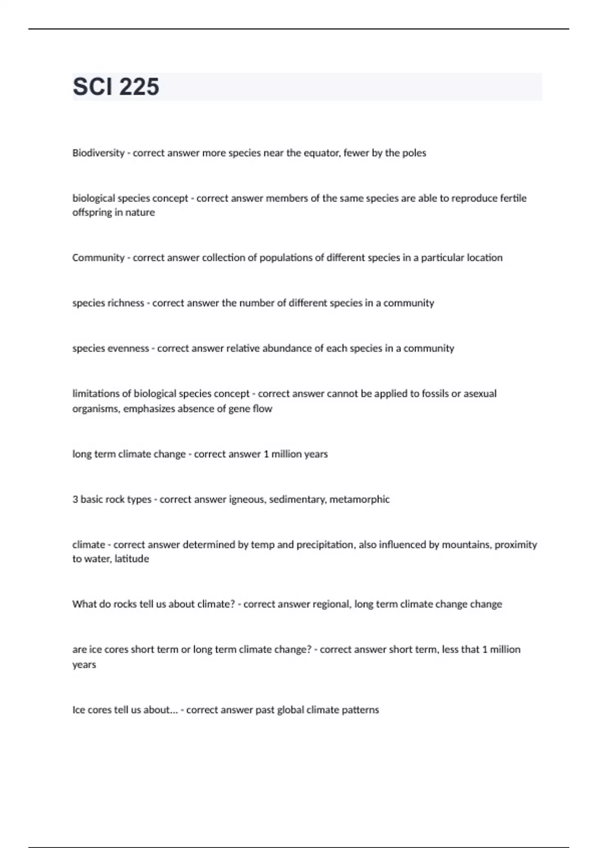 SCI 225Biodiversity - correct answer more species near the equator, fewer by the poles biological species concept - correct answer members of the same species are able to reproduce fertile offspring in nature Community - correct answer collection of populations of different species in a particular location species richness - correct answer the number of different species in a community species evenness - correct answer relative abundance of each species in a community limitations of biological species concept - correct answer cannot be applied to fossils or asexual organisms, emphasizes absence of gene flow long term climate change - correct answer 1 million years 3 basic rock types - correct answer igneous, sedimentary, metamorphic climate - correct answer determined by temp and precipitation, also influenced by mountains, proximity to water, latitude What do rocks tell us about climate? - correct answer regional, long term climate change change are ice cores short term or long term climate change? - correct answer short term, less that 1 million years Ice cores tell us about... - correct answer past global climate patterns