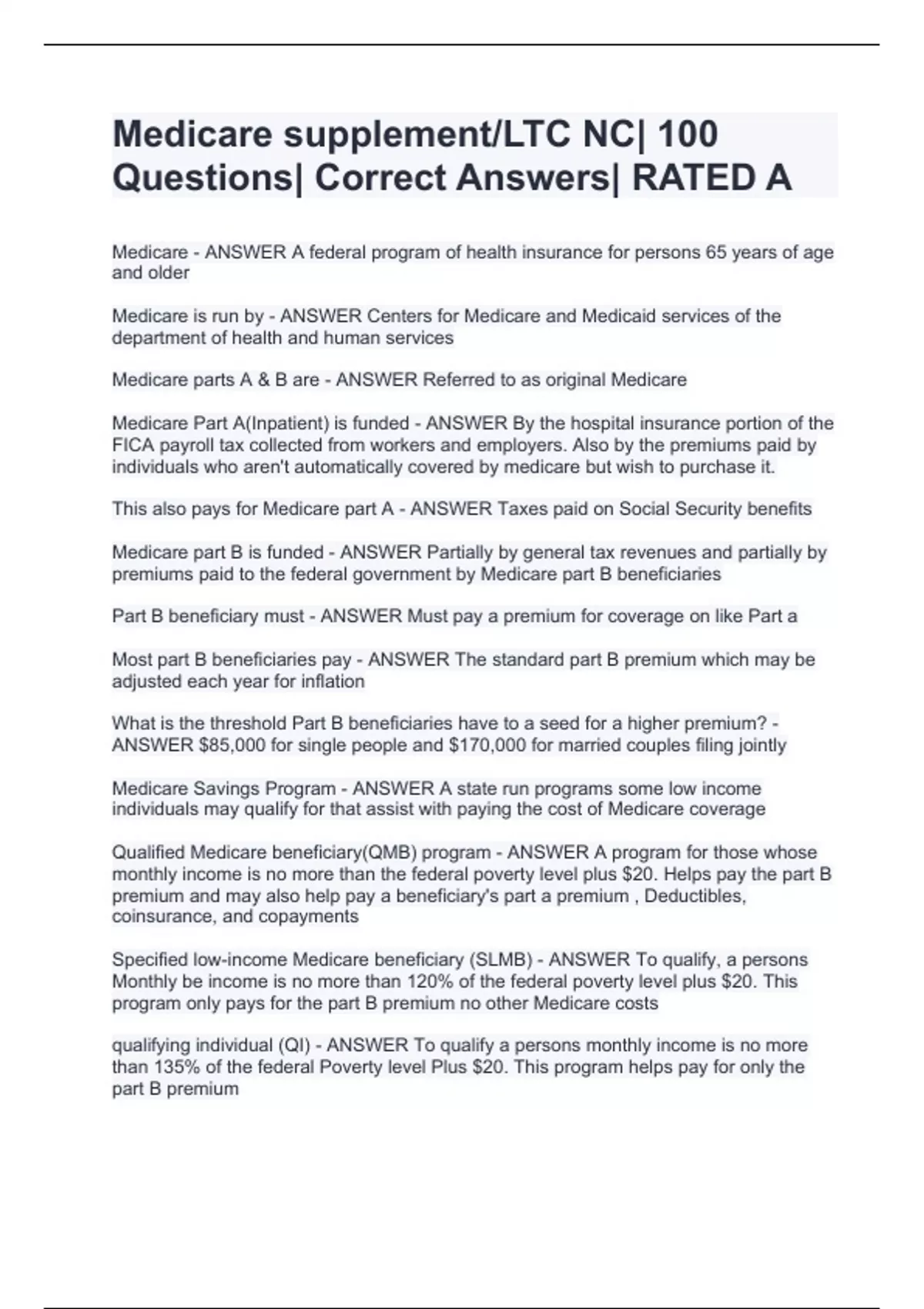 Medicare supplement/LTC NC| 100 Questions| Correct Answers| RATED A