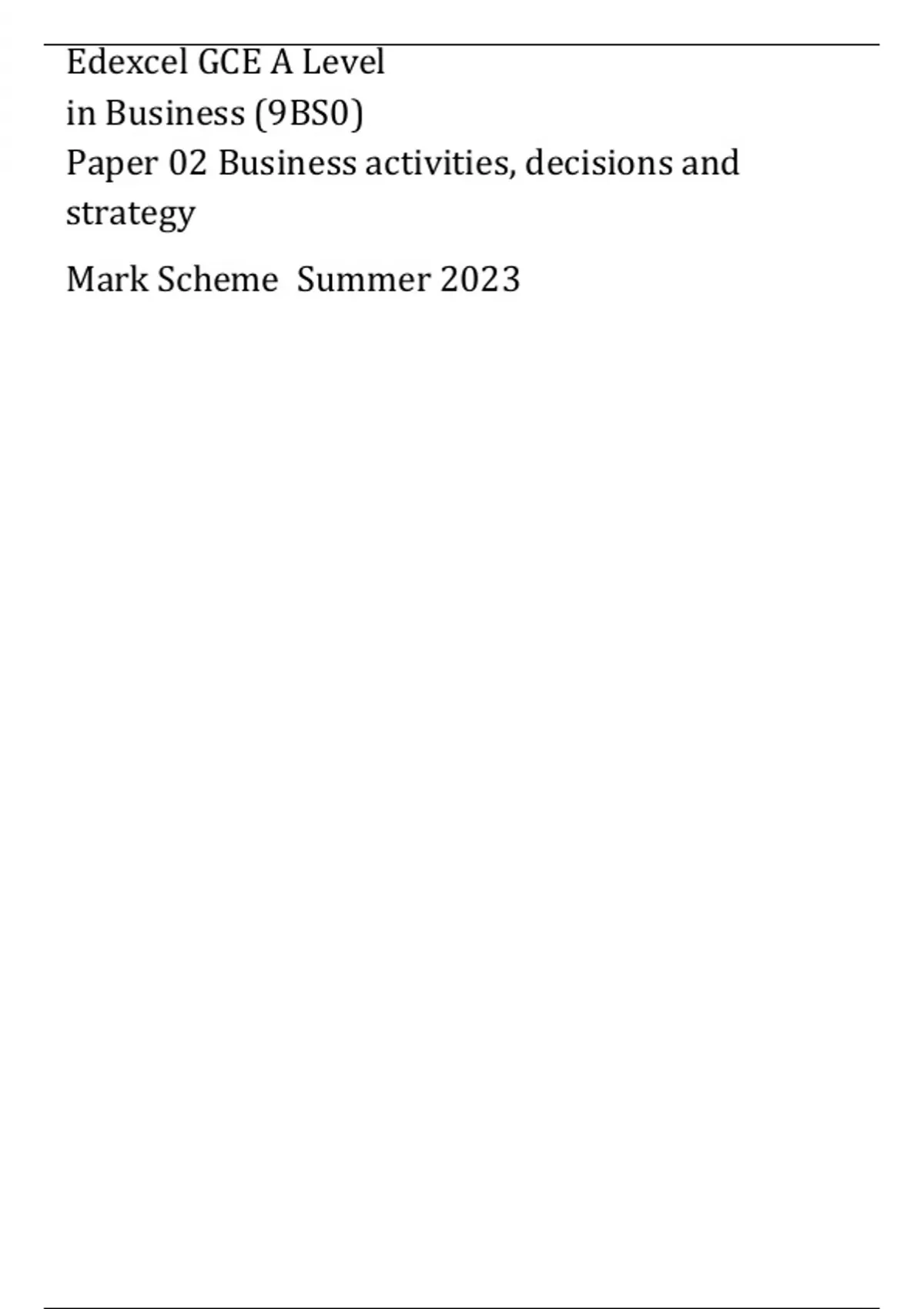 Edexcel GCE A Level in Business (9BS0) Paper 02 Business activities, decisions and strategy Mark Scheme Summer 2023