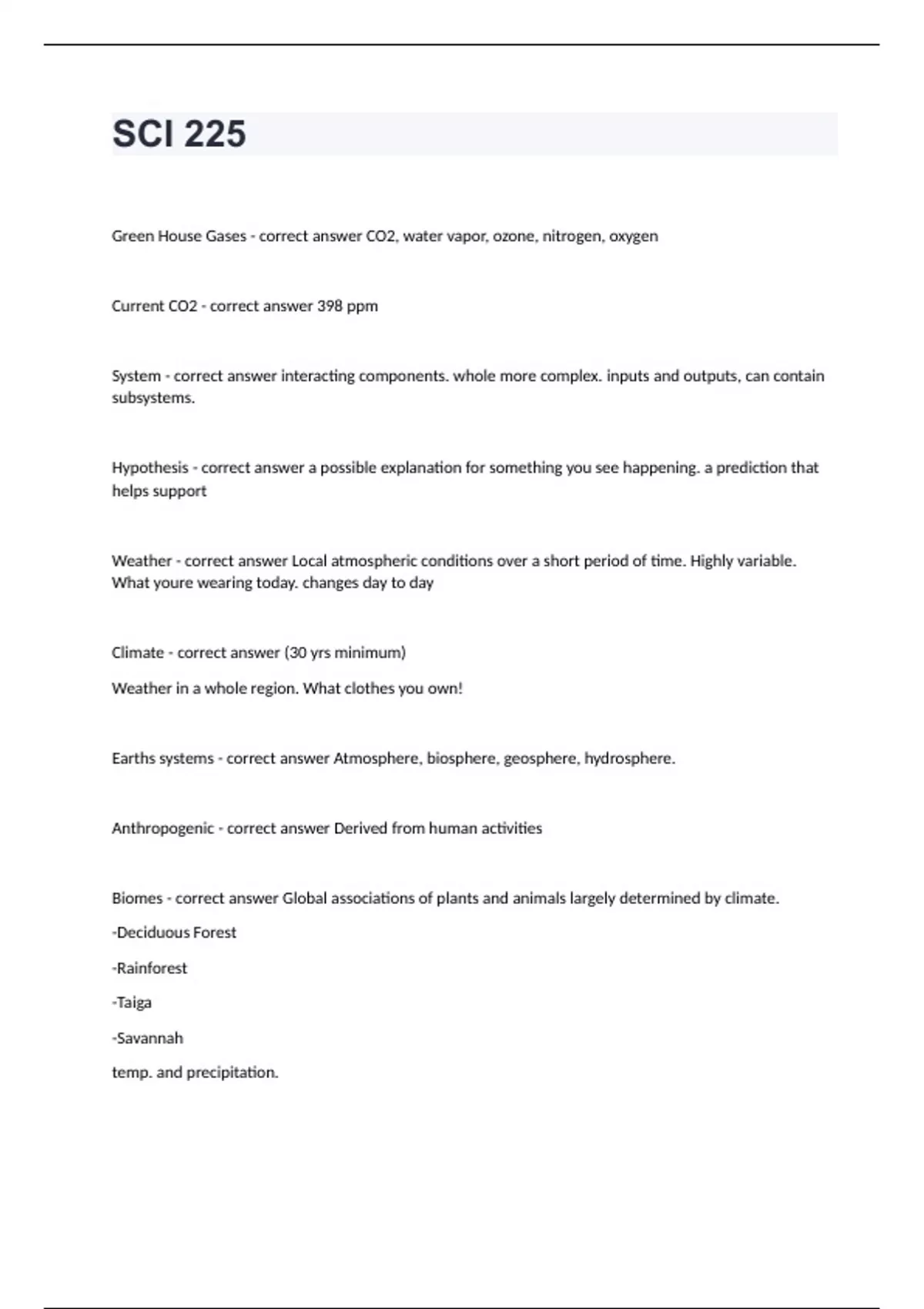 SCI 225Green House Gases - correct answer CO2, water vapor, ozone, nitrogen, oxygen Current CO2 - correct answer 398 ppm System - correct answer interacting components. whole more complex. inputs and outputs, can contain subsystems. Hypothesis - correct answer a possible explanation for something you see happening. a prediction that helps support Weather - correct answer Local atmospheric conditions over a short period of time. Highly variable. What youre wearing today. changes day to day Climate - correct answer (30 yrs minimum) Weather in a whole region. What clothes you own! Earths systems - correct answer Atmosphere, biosphere, geosphere, hydrosphere. Anthropogenic - correct answer Derived from human activities Biomes - correct answer Global associations of plants and animals largely determined by climate. -Deciduous Forest -Rainforest -Taiga -Savannah