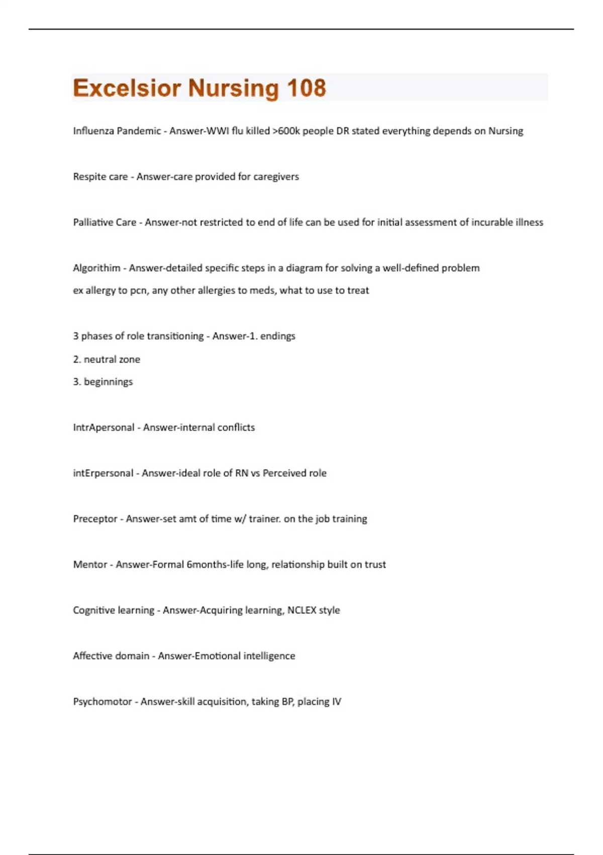 Influenza Pandemic - Answer-WWI flu killed >600k people DR stated everything depends on Nursing Respite care - Answer-care provided for caregivers Palliative Care - Answer-not restricted to end of life can be used for initial assessment of incurable illness Algorithim - Answer-detailed specific steps in a diagram for solving a well-defined problem ex allergy to pcn, any other allergies to meds, what to use to treat 3 phases of role transitioning - Answer-1. endings 2. neutral zone 3. beginnings IntrApersonal - Answer-internal conflicts intErpersonal - Answer-ideal role of RN vs Perceived role Preceptor - Answer-set amt of time w/ trainer. on the job training Mentor - Answer-Formal 6months-life long, relationship built on trust Cognitive learning - Answer-Acquiring learning, NCLEX style Affective domain - Answer-Emotional intelligence Psychomotor - Answer-skill acquisition, taking BP, placing IVKinesthetic learning - Answer-touch, feel, physical learning Auditory learning - Answer-listening, speaking Visual - Answer-seeing (words ideas) NonMalefience - Answer-No harm intentional or unintentional ex giving narc before signing paper Pulling a pt with thin skin and opening it. Short term violation chemo but long term greater good is another example Justice - Answer-fair tx Autonomy - Answer-Independent decision making Beneficence - Answer-Promote good, compassion, consider pts beliefs Fidelity - Answer-Keeping a commitment Veracity - Answer-Truth * foundation of therapeutic relationship Altruism - Answer-concern for others, doing good Deontology - Answer-ethical decisions universal values advantage- right if each person are considered disadvantage- diff to apply when could be harmful to person. ex continued tx for vegetative statePaternalism - Answer-pt states fear of lung cancer and states he will kill himself, Provider decides not to tell pt dx