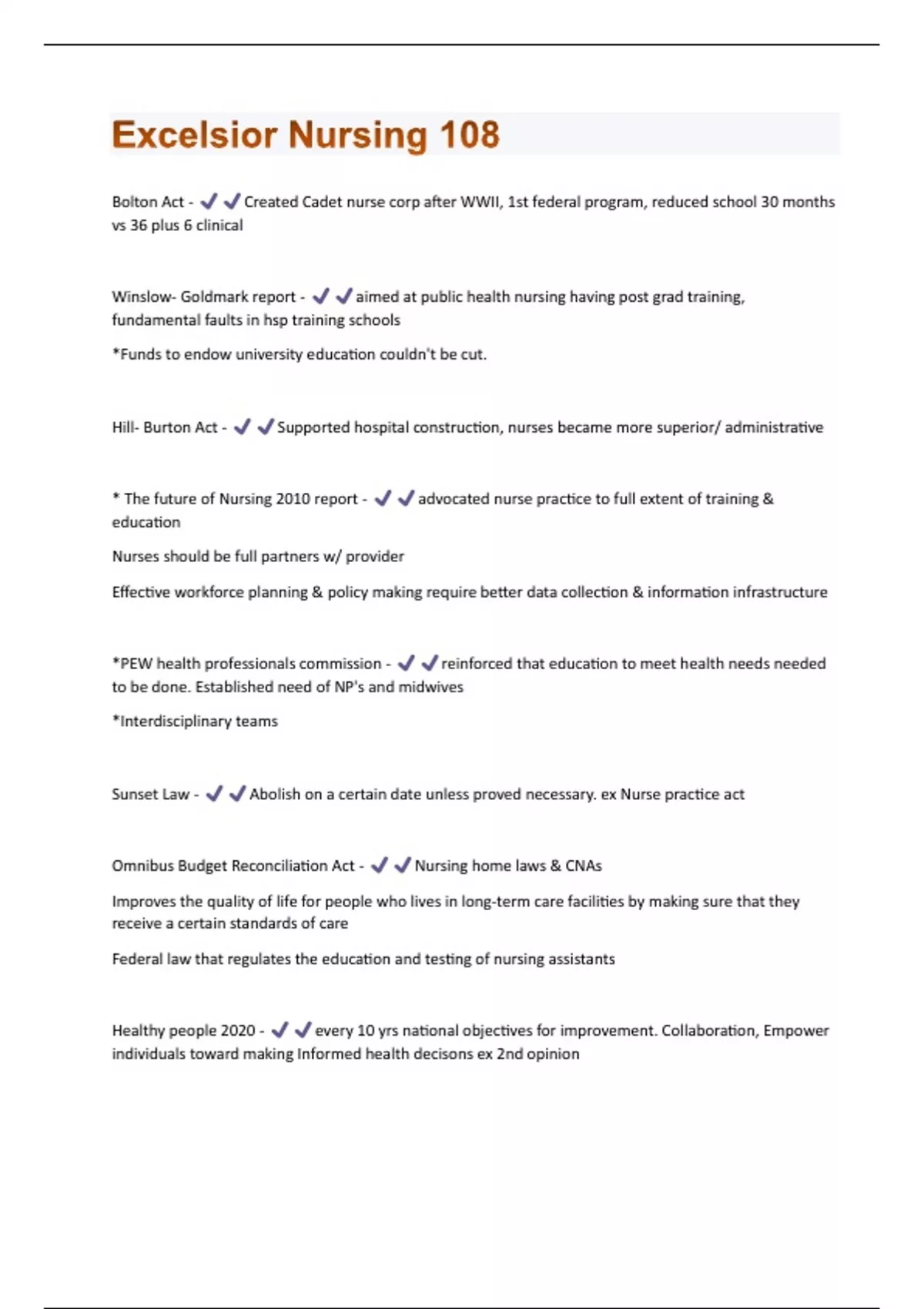 Bolton Act - Created Cadet nurse corp after WWII, 1st federal program, reduced school 30 months vs 36 plus 6 clinical Winslow- Goldmark report - aimed at public health nursing having post grad training, fundamental faults in hsp training schools *Funds to endow university education couldn't be cut. Hill- Burton Act - Supported hospital construction, nurses became more superior/ administrative * The future of Nursing 2010 report - advocated nurse practice to full extent of training & education Nurses should be full partners w/ provider Effective workforce planning & policy making require better data collection & information infrastructure *PEW health professionals commission - reinforced that education to meet health needs needed to be done. Established need of NP's and midwives *Interdisciplinary teams Sunset Law - Abolish on a certain date unless proved necessary. ex Nurse practice act Omnibus Budget Reconciliation Act - Nursing home laws & CNAs Improves the quality of life for people who lives in long-term care facilities by making sure that they receive a certain standards of care Federal law that regulates the education and testing of nursing assistants Healthy people 2020 - every 10 yrs national objectives for improvement. Collaboration, Empower individuals toward making Informed health decisons ex 2nd opinionANA Position paper - Nursing should be done in Institutions of Higher learning. BSN as min education Confusing to grads. Technical nurse and Professional nurse Brown Report - education belongs in College & Universities, mainstream Influenza Pandemic - WWI flu killed >600k people Palliative Care - not restricted to end of life can be used for initial assessment of incurable illness Algorithim - detailed specific steps in a diagram for solving a well-defined problem 3 phases of role transitioning - 1. endings 2. neutral zone 3. beginnings IntrApersonal - internal conflicts intErpersonal - ideal role of RN vs Perceived role Affective domain - Emotional intelligence Psychomotor - skill acquisition, taking BP, placing IV NonMalefience - No harm intentional or unintentional ex giving narc before signing paper Pulling a pt with thin skin and opening it.Short term violation chemo but long term greater good is another example Justice - fair tx Autonomy - Independent decision making Beneficence - Promote good, compassion, consider pts beliefs Fidelity - Keeping a commitment