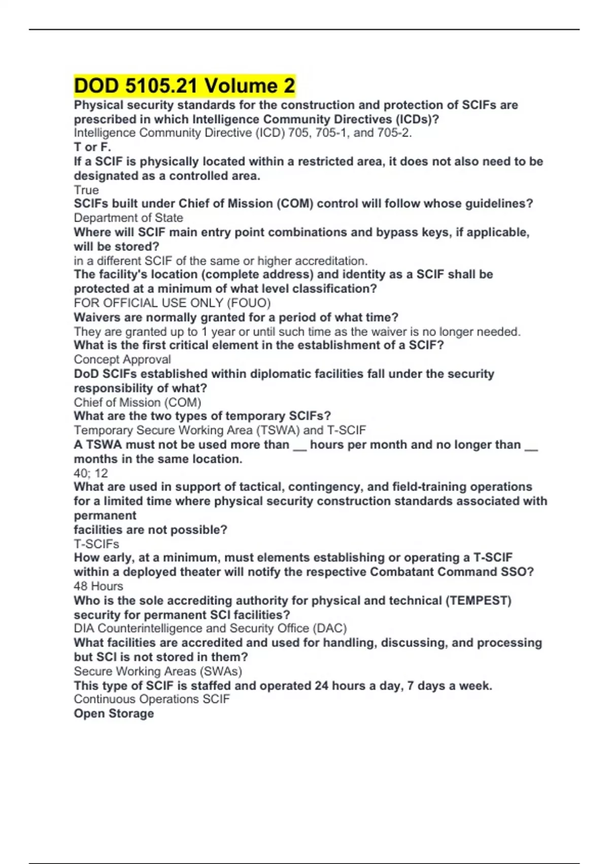 DOD 5105.21 Volume 2 Physical security standards for the construction and protection of SCIFs are prescribed in which Intelligence Community Directives (ICDs)? Intelligence Community Directive (ICD) 705, 705-1, and 705-2. T or F. If a SCIF is physically located within a restricted area, it does not also need to be designated as a controlled area. True SCIFs built under Chief of Mission (COM) control will follow whose guidelines? Department of State Where will SCIF main entry point combinations and bypass keys, if applicable, will be stored? in a different SCIF of the same or higher accreditation. The facility's location (complete address) and identity as a SCIF shall be protected at a minimum of what level classification? FOR OFFICIAL USE ONLY (FOUO) Waivers are normally granted for a period of what time? They are granted up to 1 year or until such time as the waiver is no longer needed. What is the first critical element in the establishment of a SCIF? Concept Approval DoD SCIFs established within diplomatic facilities fall under the security responsibility of what? Chief of Mission (COM)