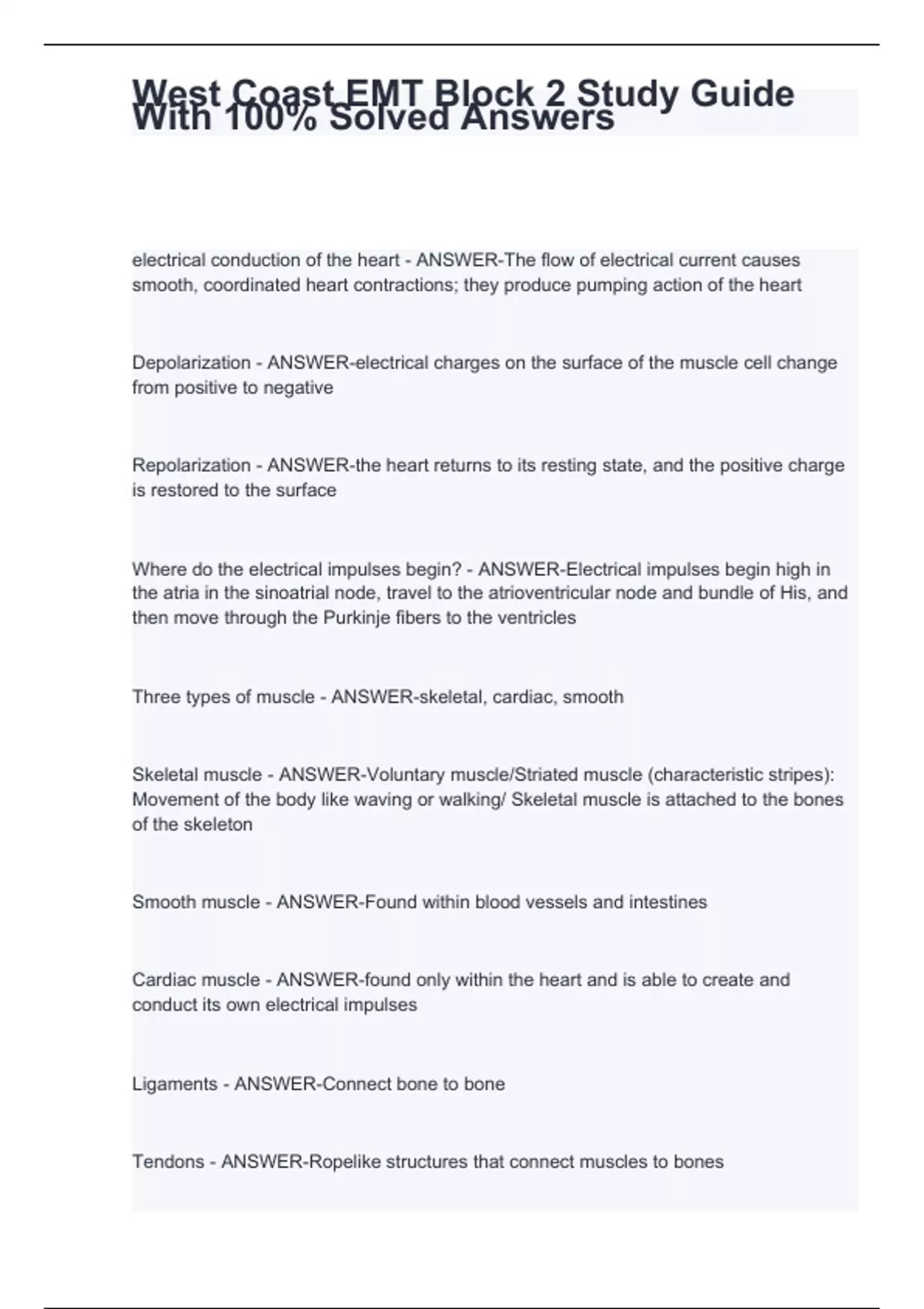 Depolarization - ANSWER-electrical charges on the surface of the muscle cell change from positive to negative Repolarization - ANSWER-the heart returns to its resting state, and the positive charge is restored to the surface Where do the electrical impulses begin? - ANSWER-Electrical impulses begin high in the atria in the sinoatrial node, travel to the atrioventricular node and bundle of His, and then move through the Purkinje fibers to the ventricles Three types of muscle - ANSWER-skeletal, cardiac, smooth Skeletal muscle - ANSWER-Voluntary muscle/Striated muscle (characteristic stripes): Movement of the body like waving or walking/ Skeletal muscle is attached to the bones of the skeleton Smooth muscle - ANSWER-Found within blood vessels and intestines Cardiac muscle - ANSWER-found only within the heart and is able to create and conduct its own electrical impulses Ligaments - ANSWER-Connect bone to bone