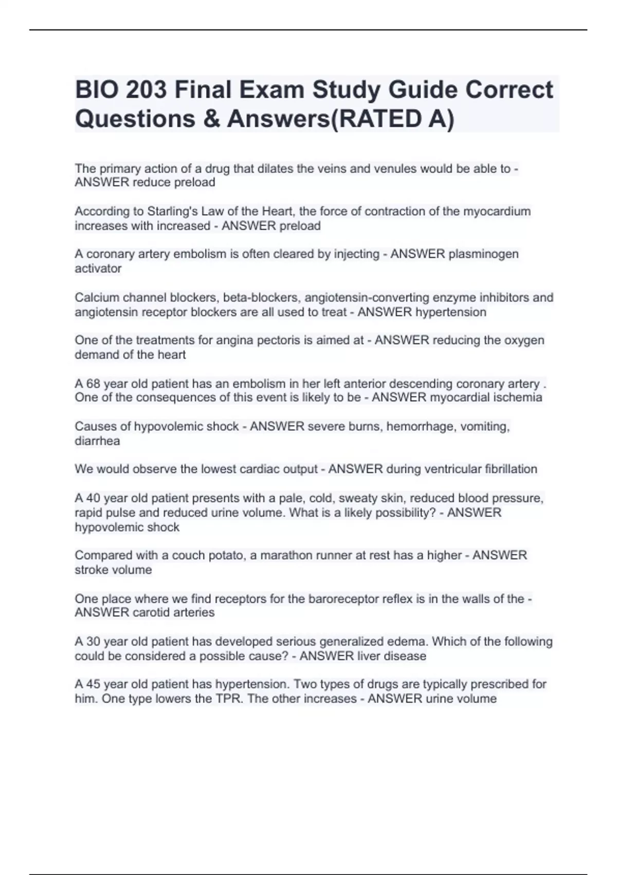 The primary action of a drug that dilates the veins and venules would be able to - ANSWER reduce preload According to Starling's Law of the Heart, the force of contraction of the myocardium increases with increased - ANSWER preload A coronary artery embolism is often cleared by injecting - ANSWER plasminogen activator Calcium channel blockers, beta-blockers, angiotensin-converting enzyme inhibitors and angiotensin receptor blockers are all used to treat - ANSWER hypertension One of the treatments for angina pectoris is aimed at - ANSWER reducing the oxygen demand of the heart A 68 year old patient has an embolism in her left anterior descending coronary artery . One of the consequences of this event is likely to be - ANSWER myocardial ischemia Causes of hypovolemic shock - ANSWER severe burns, hemorrhage, vomiting, diarrhea We would observe the lowest cardiac output - ANSWER during ventricular fibrillation A 40 year old patient presents with a pale, cold, sweaty skin, reduced blood pressure, rapid pulse and reduced urine volume. What is a likely possibility? - ANSWER hypovolemic shock Compared with a couch potato, a marathon runner at rest has a higher - ANSWER stroke volume One place where we find receptors for the baroreceptor reflex is in the walls of the - ANSWER carotid arteries A 30 year old patient has developed serious generalized edema. Which of the following could be considered a possible cause? - ANSWER liver disease A 45 year old patient has hypertension. Two types of drugs are typically prescribed for him. One type lowers the TPR. The other increases - ANSWER urine volume A patient suddenly stands up after lying down for a while. What is the immediate effect on her cardiovascular system? - ANSWER blood volume in the leg veins increases A 68 year old patient in intensive care suddenly goes into ventricular fibrillation. This emergency situation would probably be dealt with by administration of - ANSWER direct current shock to the chest The electrocardiogram following a myocardial infarction could show - ANSWER S-T segment may be elevated, T wave is inverted, or Q wave is increased in size Pacemaker cells - ANSWER have muscarinic receptors for acetylcholine, have beta-adrenergic receptors, and if the SA node fails, the AV node may take over as the heart's pacemaker The action potential of cardiac muscle cells has a "plateau", This corresponds to the time when ---- ions are entering the cell - ANSWER calcium A heart rate of below 50 beats per minute at rest is the definition of - ANSWER sinus bradycardia A sharp blow to the chest from a baseball during the vulnerable period (T wave) of the ECG can trigger an episode of ventricular fibrillation called - ANSWER commotio cordis Afterload is elevated by - ANSWER stenosis of the aortic valve As the ventricle contract, the papillary muscles pull on the - ANSWER chordae tendineae An obstruction in the popliteal artery will impair blood flow to the - ANSWER lower leg In a person as rest, the heart pumps about 5.6 liters of blood per minute into the aorta, but the whole cardiovascular system contains only about 5 liters. Explain. - ANSWER the 5.6 liters of blood pumped into the aorta returns to the heart The right ventricular myocardium is thinner that the left because it - ANSWER pumps into a low resistance circuit In an experiment, the blood flow through the right renal artery is 750 ml/min. After injection of drug C, the flow drops to 450 ml/min. Therefore, drug C was most likely to have caused - ANSWER vasoconstriction of the renal arterioles We normally find oxygenated blood in - ANSWER pulmonary veins Which of the following statements is wrong? -veins hold more blood at a lower pressure than arteries -blood According to Starling's Law of the Heart, the force of contraction of the myocardium increases with increased