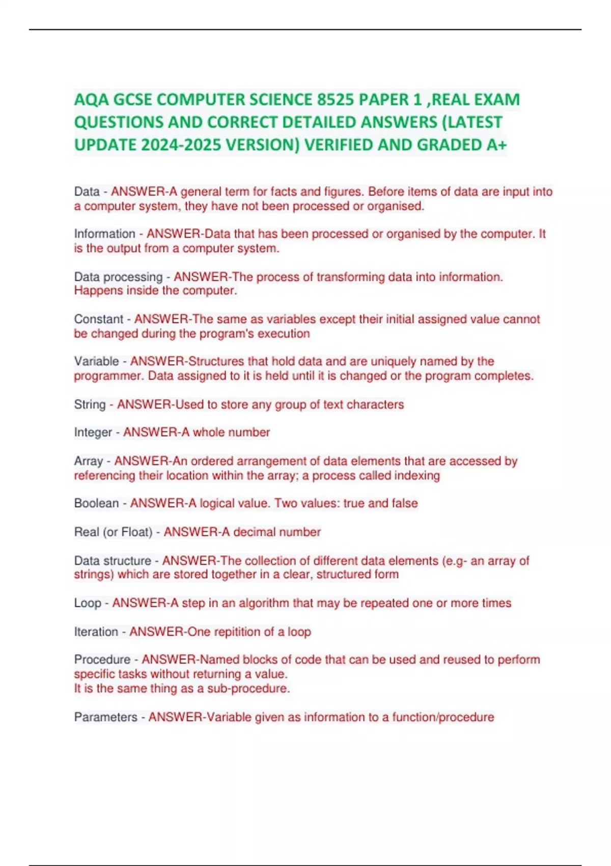 AQA GCSE COMPUTER SCIENCE 8525 PAPER 1 ,REAL EXAM QUESTIONS AND CORRECT DETAILED ANSWERS (LATEST UPDATE VERSION) VERIFIED AND GRADED A