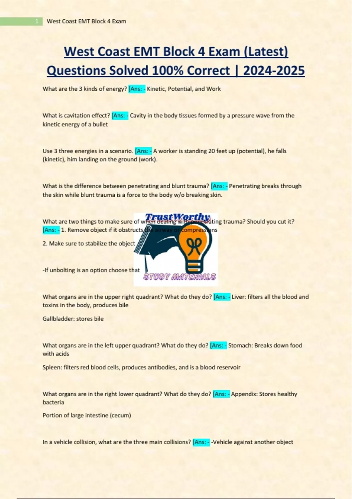 West Coast EMT Block 4 Exam (Latest) Questions Solved 100% Correct |