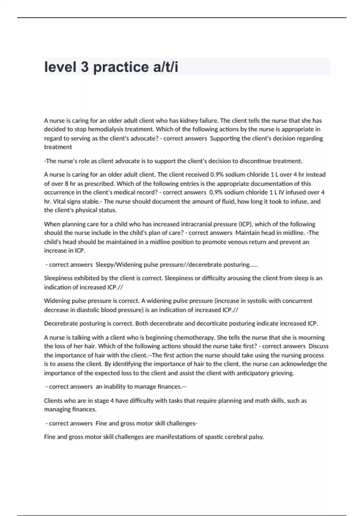 level 3 practice a/t/i A nurse is caring for an older adult client who has kidney failure. The client tells the nurse that she has decided to stop hemodialysis treatment. Which of the following actions by the nurse is appropriate in regard to serving as the client's advocate? - correct answers Supporting the client's decision regarding treatment -The nurse's role as client advocate is to support the client's decision to discontinue treatment. A nurse is caring for an older adult client. The client received 0.9% sodium chloride 1 L over 4 hr instead of over 8 hr as prescribed. Which of the following entries is the appropriate documentation of this occurrence in the client's medical record? - correct answers 0.9% sodium chloride 1 L IV infused over 4 hr. Vital signs stable.- The nurse should document the amount of fluid, how long it took to infuse, and the client's physical status. When planning care for a child who has increased intracranial pressure (ICP), which of the following should the nurse include in the child's plan of care? - correct answers Maintain head in midline. -The child's head should be maintained in a midline position to promote venous return and prevent an increase in ICP. - correct answers Sleepy/Widening pulse pressure//decerebrate posturing..... Sleepiness exhibited by the client is correct. Sleepiness or difficulty arousing the client from sleep is an indication of increased ICP.// Widening pulse pressure is correct. A widening pulse pressure (increase in systolic with concurrent decrease in diastolic blood pressure) is an indication of increased ICP.// Decerebrate posturing is correct. Both decerebrate and decorticate posturing indicate increased ICP. A nurse is talking with a client who is beginning chemotherapy. She tells the nurse that she is mourning the loss of her hair. Which of the following actions should the nurse take first? - correct answers Discuss the importance of hair with the client.--The first action the nurse should take using the nursing process is to assess the client. By identifying the importance of hair to the client, the nurse can acknowledge the importance of the expected loss to the client and assist the client with anticipatory grieving. - correct answers an inability to manage finances.-- Clients who are in stage 4 have difficulty with tasks that require planning and math skills, such as managing finances. - correct answers Fine and gross motor skill challenges- Fine and gross motor skill challenges are manifestations of spastic cerebral palsy.