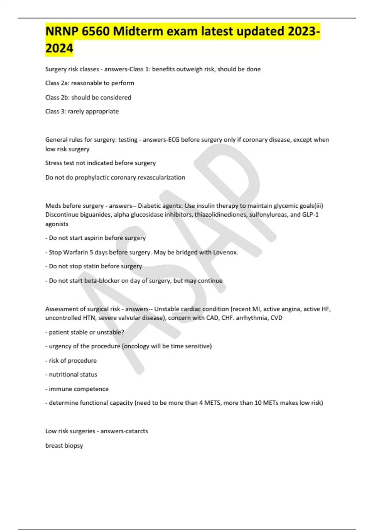 NRNP 6560 Midterm exam latest updated Surgery risk classes - answers-Class 1: benefits outweigh risk, should be done Class 2a: reasonable to perform Class 2b: should be considered Class 3: rarely appropriate General rules for surgery: testing - answers-ECG before surgery only if coronary disease, except when low risk surgery Stress test not indicated before surgery Do not do prophylactic coronary revascularization