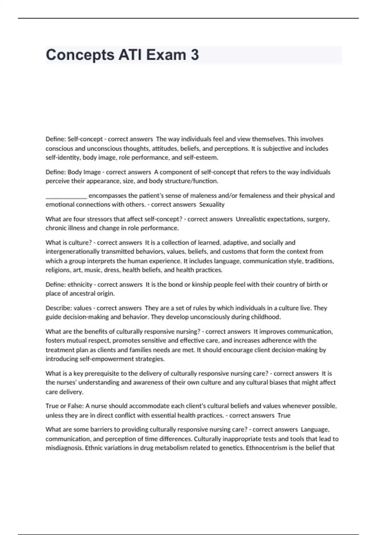 Concepts ATI Exam 3 Define: Self-concept - correct answers The way individuals feel and view themselves. This involves conscious and unconscious thoughts, attitudes, beliefs, and perceptions. It is subjective and includes self-identity, body image, role performance, and self-esteem. Define: Body Image - correct answers A component of self-concept that refers to the way individuals perceive their appearance, size, and body structure/function. ____________ encompasses the patient's sense of maleness and/or femaleness and their physical and emotional connections with others. - correct answers Sexuality What are four stressors that affect self-concept? - correct answers Unrealistic expectations, surgery, chronic illness and change in role performance. What is culture? - correct answers It is a collection of learned, adaptive, and socially and intergenerationally transmitted behaviors, values, beliefs, and customs that form the context from which a group interprets the human experience. It includes language, communication style, traditions, religions, art, music, dress, health beliefs, and health practices. Define: ethnicity - correct answers It is the bond or kinship people feel with their country of birth or place of ancestral origin. Describe: values - correct answers They are a set of rules by which individuals in a culture live. They guide decision-making and behavior. They develop unconsciously during childhood. What are the benefits of culturally responsive nursing? - correct answers It improves communication, fosters mutual respect, promotes sensitive and effective care, and increases adherence with the treatment plan as clients and families needs are met. It should encourage client decision-making by introducing self-empowerment strategies. What is a key prerequisite to the delivery of culturally responsive nursing care? - correct answers It is the nurses' understanding and awareness of their own culture and any cultural biases that might affect care delivery. True or False: A nurse should accommodate each client's cultural beliefs and values whenever possible, unless they are in direct conflict with essential health practices. - correct answers True What are some barriers to providing culturally responsive nursing care? - correct answers Language, communication, and perception of time differences. Culturally inappropriate tests and tools that lead to misdiagnosis. Ethnic variations in drug metabolism related to genetics. Ethnocentrism is the belief that
