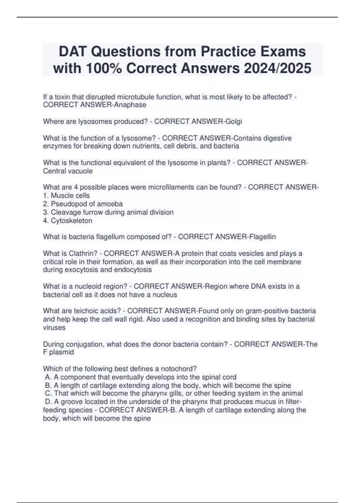 DAT Practice Test Questions and Answers 2024/2025 apoptosis - CORRECT ANSWER-mediated cell death Change salt concentrations or pH - CORRECT ANSWER-how to remove a peripheral protein add a detergent - CORRECT ANSWER-how to remove an integral protein a light centrifuge - CORRECT ANSWER-precipitate out cells or nuclei a heavy centrifuge - CORRECT ANSWER-extract small, soluble proteins ammonia, methane, water, hydrogen - CORRECT ANSWER-the Miller-Urey experiment used... muscle cells - CORRECT ANSWER-microfilaments are found in... turgid - CORRECT ANSWER-means it becomes swollen plasmolysis - CORRECT ANSWER-means it become shrunken spine - CORRECT ANSWER-the notochord becomes the... poikilothermic - CORRECT ANSWER-another word for heterothermic zona pellucida - CORRECT ANSWER-what binds the sperm phrenology - CORRECT ANSWER-the study of the contours of the brain vectors - CORRECT ANSWER-these do gene-splicing cladogram - CORRECT ANSWER-determines if organisms are related, but not based on genes gel electrophoresis - CORRECT ANSWER-determine molecular similarity karyotype - CORRECT ANSWER-tells the size, shape, and number of chromosomes PCR - CORRECT ANSWER-used to c