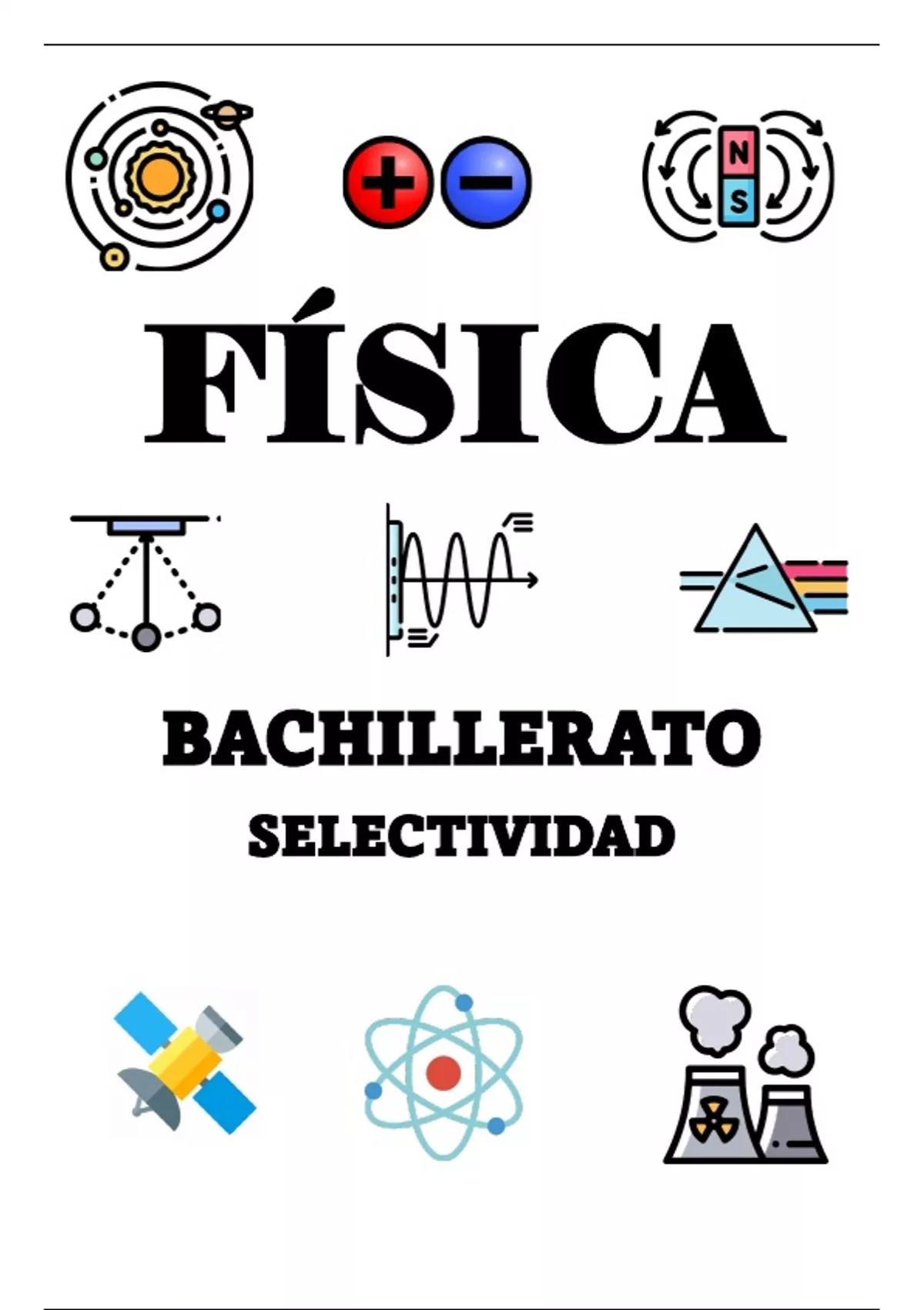 Este libro de 120 páginas lo he hecho yo a lo largo de Bachillerato, a partir de los apuntes que tomo en clase y las diapositivas que usaba mi profesor para explicar. Todas las fórmulas, ecuaciones, definiciones teóricas, representaciones, explicaciones... están aquí. Contiene todos los contenidos del examen de selectividad de Física, dividido en bloques, y estos en temas. Tiene al final enunciados de ejercicios de selectividad de cada bloque.