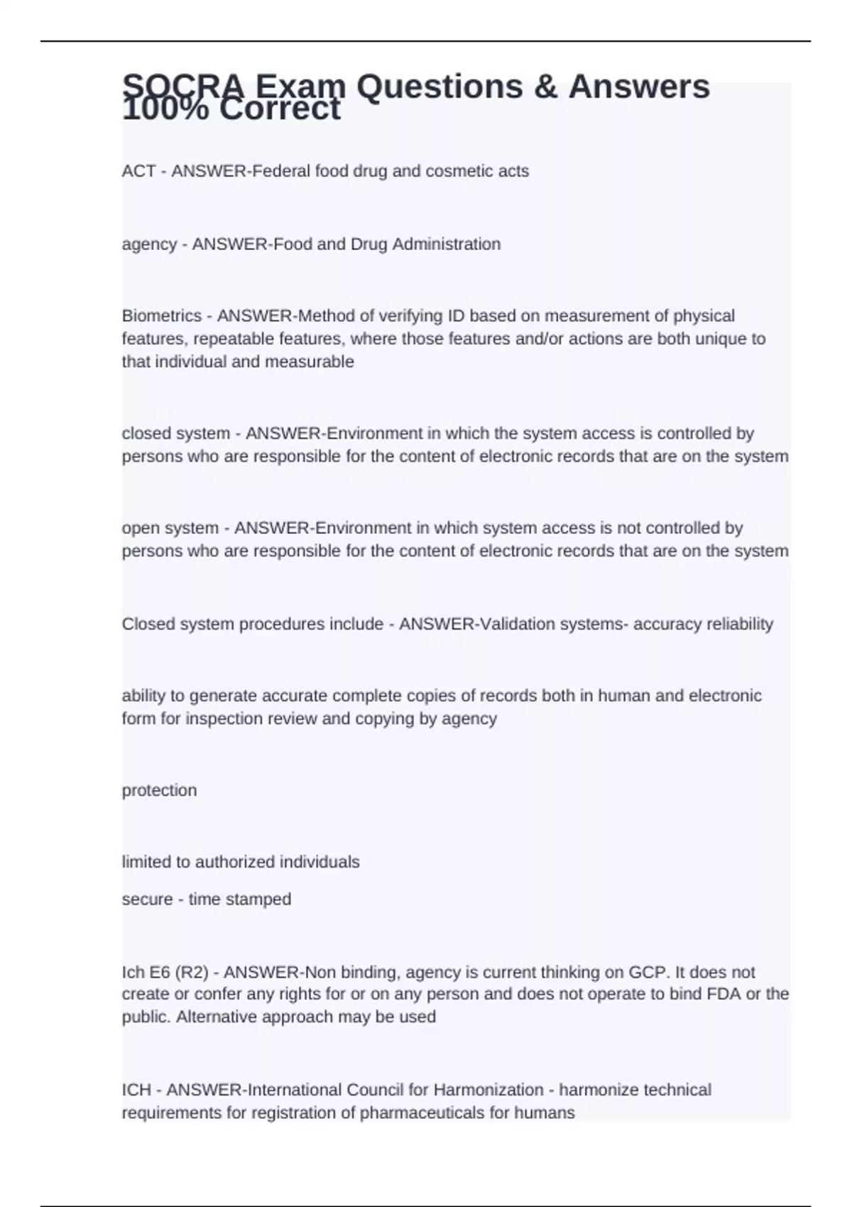 ACT - ANSWER-Federal food drug and cosmetic acts agency - ANSWER-Food and Drug Administration Biometrics - ANSWER-Method of verifying ID based on measurement of physical features, repeatable features, where those features and/or actions are both unique to that individual and measurable closed system - ANSWER-Environment in which the system access is controlled by persons who are responsible for the content of electronic records that are on the system open system - ANSWER-Environment in which system access is not controlled by persons who are responsible for the content of electronic records that are on the system Closed system procedures include - ANSWER-Validation systems- accuracy reliability ability to generate accurate complete copies of records both in human and electronic form for inspection review and copying by agency protection limited to authorized individuals secure - time stamped Ich E6 (R2) - ANSWER-Non binding, agency is current thinking on GCP. It does not create or confer any rights for or on any person and does not operate to bind FDA or the public. Alternative approach may be used