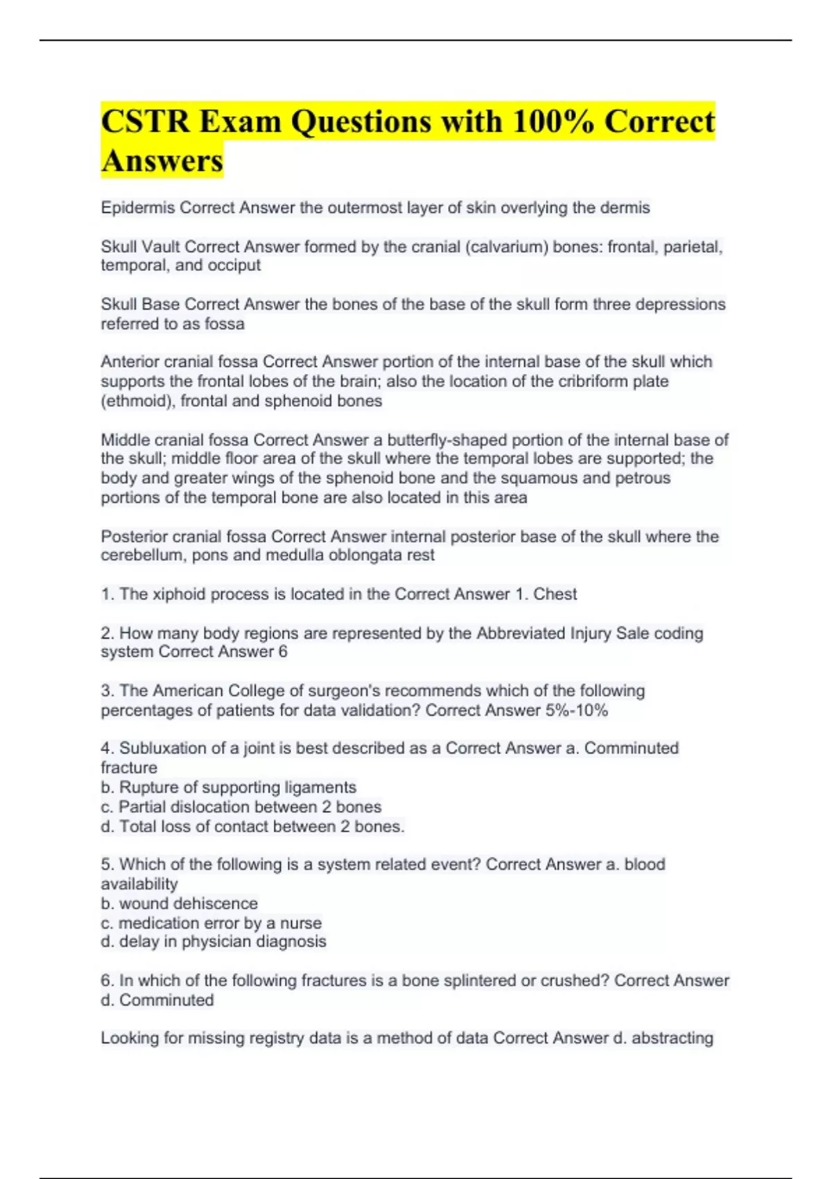 Epidermis Correct Answer the outermost layer of skin overlying the dermis Skull Vault Correct Answer formed by the cranial (calvarium) bones: frontal, parietal, temporal, and occiput Skull Base Correct Answer the bones of the base of the skull form three depressions referred to as fossa Anterior cranial fossa Correct Answer portion of the internal base of the skull which supports the frontal lobes of the brain; also the location of the cribriform plate (ethmoid), frontal and sphenoid bones Middle cranial fossa Correct Answer a butterfly-shaped portion of the internal base of the skull; middle floor area of the skull where the temporal lobes are supported; the body and greater wings of the sphenoid bone and the squamous and petrous portions of the temporal bone are also located in this area Posterior cranial fossa Correct Answer internal posterior base of the skull where the cerebellum, pons and medulla oblongata rest 1. The xiphoid process is located in the Correct Answer 1. Chest 2. How many body regions are represented by the Abbreviated Injury Sale coding system Correct Answer 6 3. The American College of surgeon's recommends which of the following percentages of patients for data validation? Correct Answer 5%-10% 4. Subluxation of a joint is best described as a Correct Answer a. Comminuted fracture b. Rupture of supporting ligaments c. Partial dislocation between 2 bones d. Total loss of contact between 2 bones. 5. Which of the following is a system related event? Correct Answer a. blood availability b. wound dehiscence c. medication error by a nurse d. delay in physician diagnosis 6. In which of the following fractures is a bone splintered or crushed? Correct Answer d. Comminuted Looking for missing registry data is a method of data Correct Answer d. abstracting
