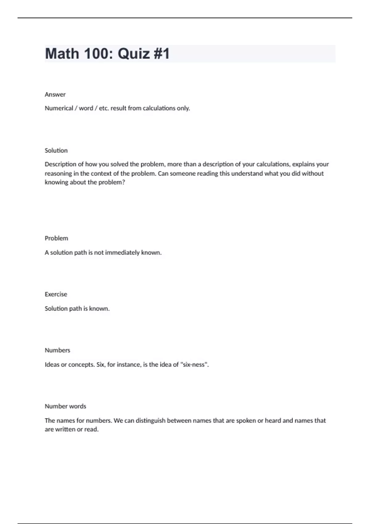 Math 100: Quiz #1Answer Numerical / word / etc. result from calculations only. Solution Description of how you solved the problem, more than a description of your calculations, explains your reasoning in the context of the problem. Can someone reading this understand what you did without knowing about the problem? Problem A solution path is not immediately known. Exercise Solution path is known. Numbers Ideas or concepts. Six, for instance, is the idea of "six-ness". Number words The names for numbers. We can distinguish between names that are spoken or heard and names that are written or read. Number Word Sequence (forward and backward) 1, 2, 3, 4, 5... and 5, 4, 3, 2, 1... Numerals The written symbols for numbers, for example, 27, 8, and 346. The then digits from 0 to 9 can also be referred to as this. As a List The set of counting numbers is an ordered list, starting with 1 and increasing by 1 from one term to the next (1, 2, 3, 4, ...) Telling How Many A counting number tells how many objects are in a set. The number of objects in a set is called the cardinality. Counting All When a child needs to recount initial group before counting total. Counting On When a child can count from last number of the initial group to get total. This can be an advancement from Counting All, but the student using this strategy can mean many different things.