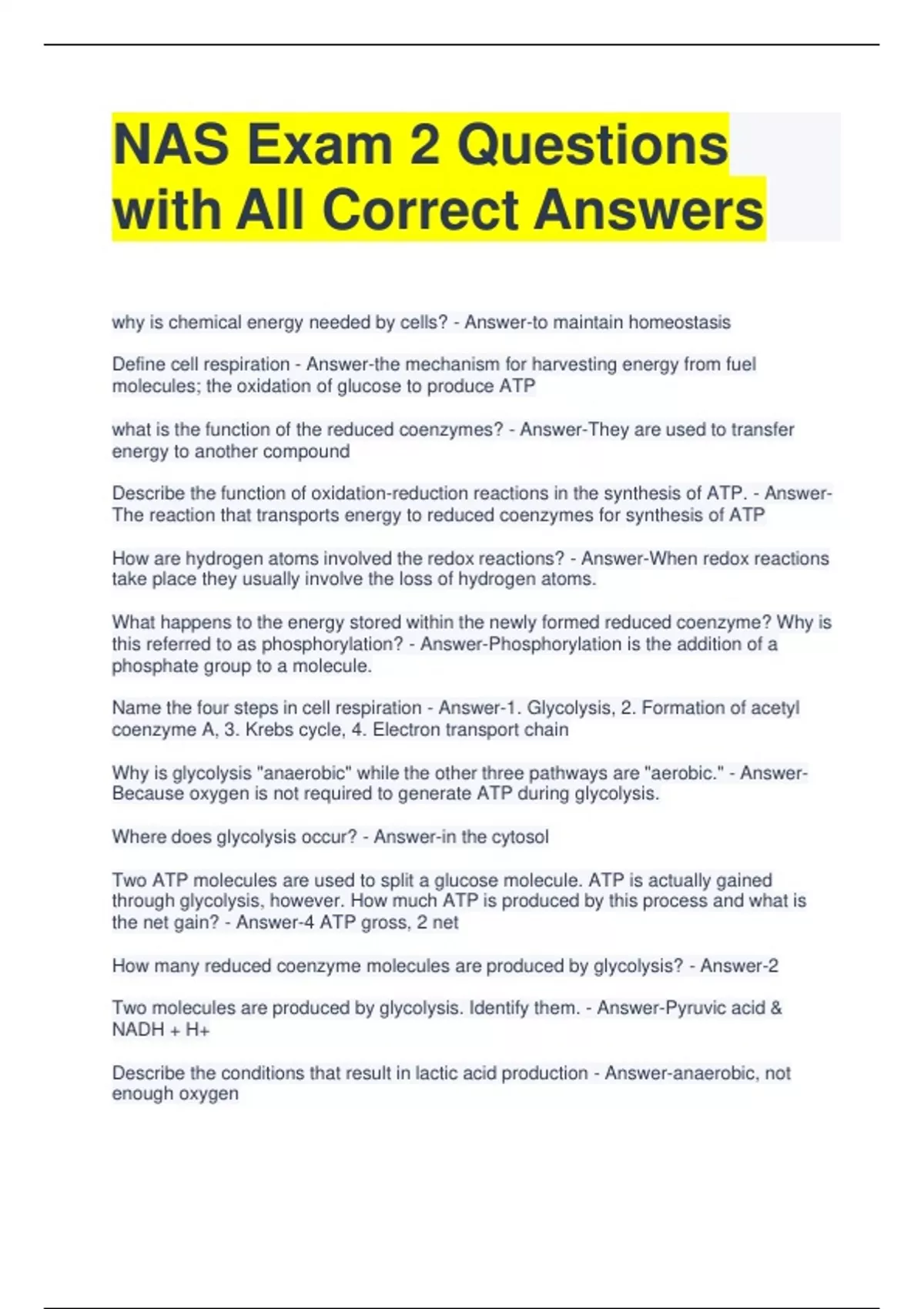 NAS Exam 2 Questions with All Correct Answers why is chemical energy needed by cells? - Answer-to maintain homeostasis Define cell respiration - Answer-the mechanism for harvesting energy from fuel molecules; the oxidation of glucose to produce ATP what is the function of the reduced coenzymes? - Answer-They are used to transfer energy to another compound Describe the function of oxidation-reduction reactions in the synthesis of ATP. - Answer- The reaction that transports energy to reduced coenzymes for synthesis of ATP How are hydrogen atoms involved the redox reactions? - Answer-When redox reactions take place they usually involve the loss of hydrogen atoms. What happens to the energy stored within the newly formed reduced coenzyme? Why is this referred to as phosphorylation? - Answer-Phosphorylation is the addition of a phosphate group to a molecule. Name the four steps in cell respiration - Answer-1. Glycolysis, 2. Formation of acetyl coenzyme A, 3. Krebs cycle, 4. Electron transport chain Why is glycolysis "anaerobic" while the other three pathways are "aerobic." - Answer- Because oxygen is not required to generate ATP during glycolysis. Where does glycolysis occur? - Answer-in the cytosol Two ATP molecules are used to split a glucose molecule. ATP is actually gained through glycolysis, however. How much ATP is produced by this process and what is the net gain? - Answer-4 ATP gross, 2 net How many reduced coenzyme molecules are produced by glycolysis? - Answer-2 Two molecules are produced by glycolysis. Identify them. - Answer-Pyruvic acid & NADH + H+ Describe the conditions that result in lactic acid production - Answer-anaerobic, not enough oxygen Where within the cell will further oxidation of pyruvic acid molecules occur - Answer-In the matrix of the mitochondria Describe the two steps that result in the formation of acetyl Co-enzyme A. - Answer-1. A molecule of CO2 is removed from the pyruvic acid through decarboxylation. Pyruvic acid is oxidized. 2. The acetyl group binds with Co-enzyme A to form acetyl CoA. Each glucose molecule results in the production of 6 CO2 molecules as a waste gas. How many CO2 molecules are produced in glycolysis and how many in the Krebs cycle? - Answer-2 - Glycolysis, 4 - Krebs cycle How many ATP are produced during the Krebs cycle? - Answer-2 What happens to the remainder of the energy harvested through the Krebs cycle? - Answer-It is transferred to reduced coenzymes that will go through the ETC and be converted to ATP. What is the primary function of the Krebs cycle? - Answer-The production of reduced co-enzymes. What is the function of the electron transport chain? - Answer-The synthesis of ATP What is a by-production of the ETC reaction - Answer-Water as the H- is released and combined w/ oxygen Define Chemiosmosis - Answer-the process by which ATP is produced as hydrogen ions move down their concentration gradient.