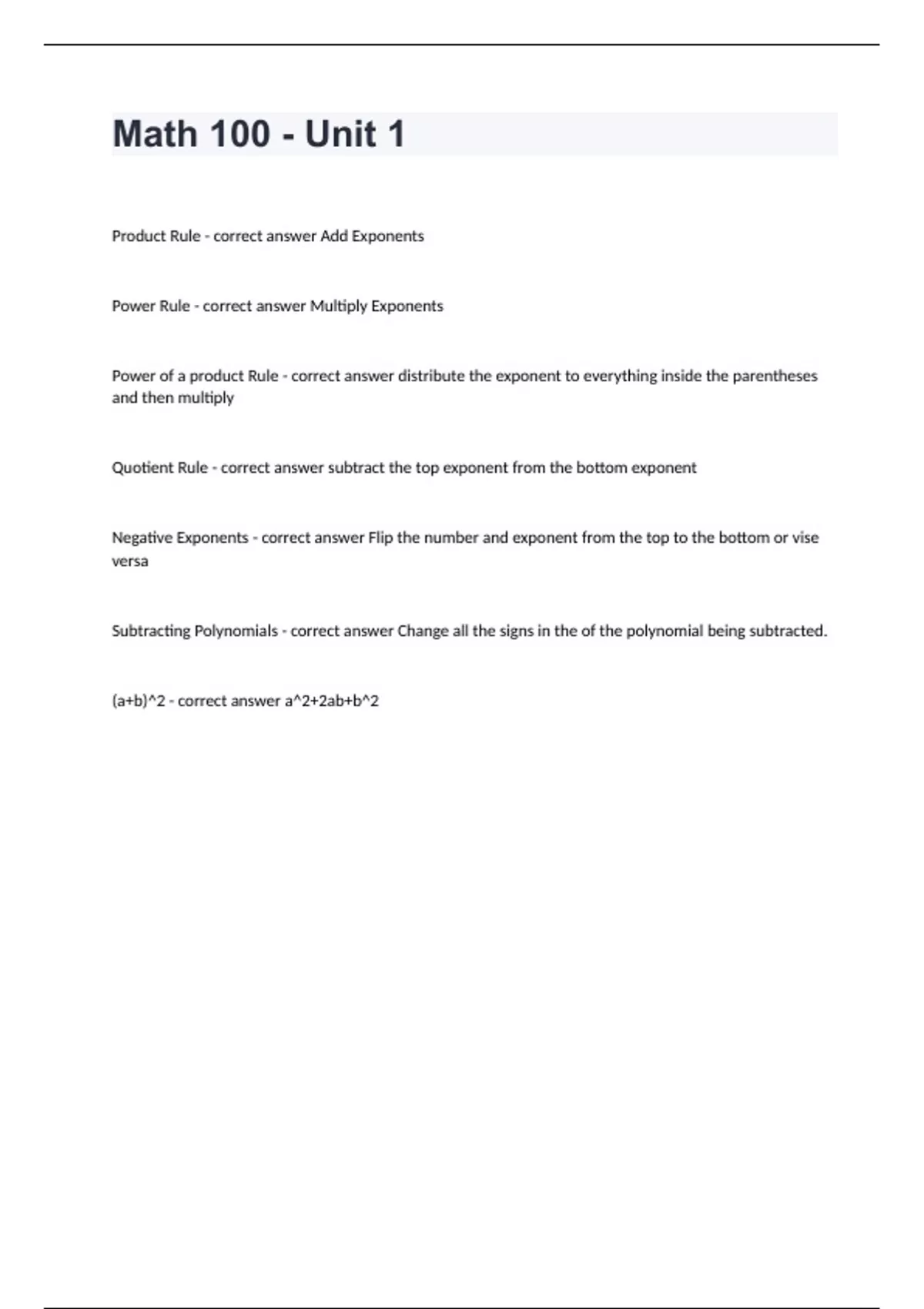 Math 100 - Unit 1 questions with 100% correct answers 2024
