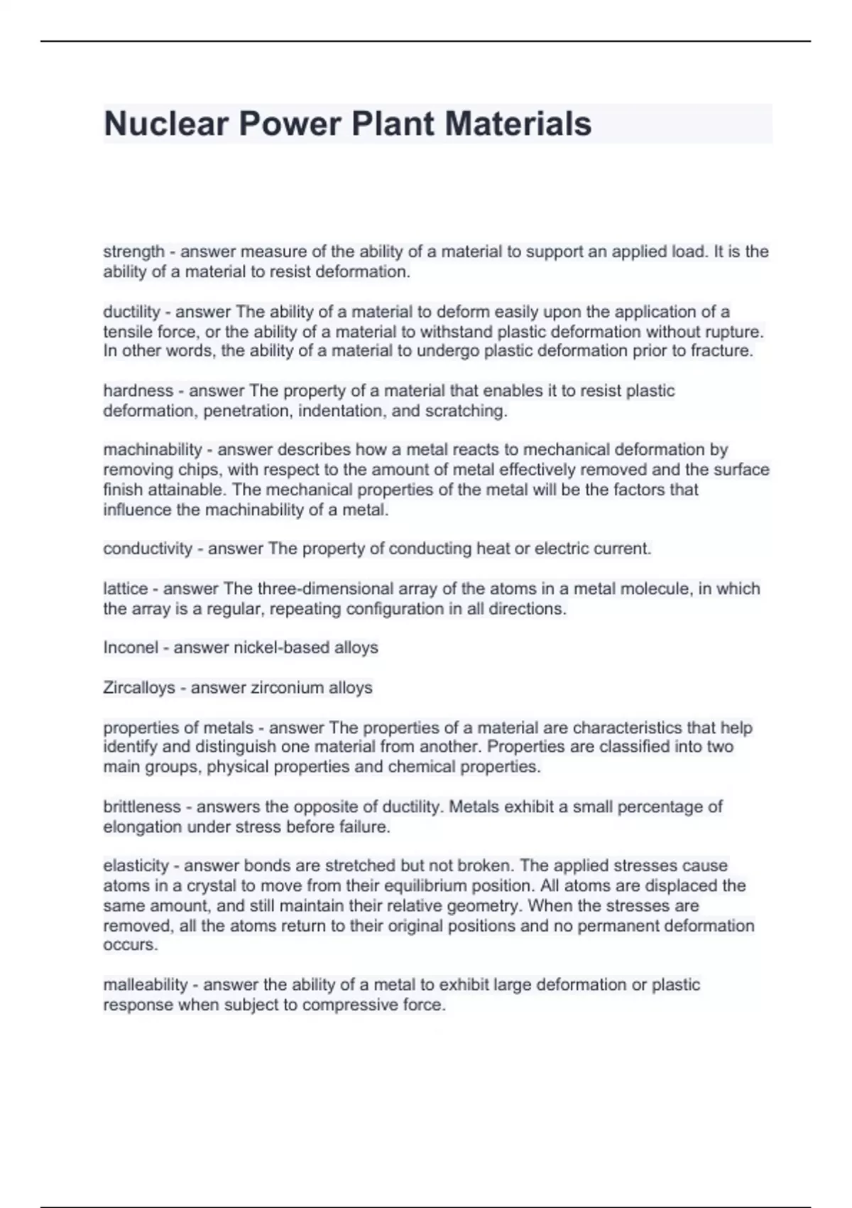 Nuclear Power Plant Materials Questions and Answers 100% Correct Answers 2024