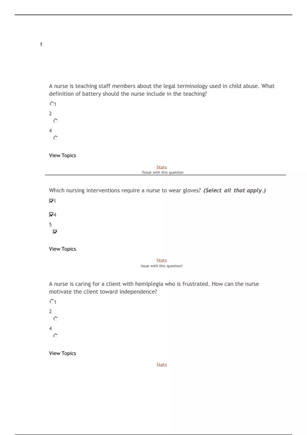 A mother whose newborn infant son has a cleft lip and palate asks how to feed her baby because he has difficulty suckling. What information should the nurse provide concerning safe feeding technique for this infant? 1 2 Correct4 View Topics Stats best tutor A client who has been in a coma for two months is being maintained on bed rest. The nurse concludes that to prevent the effects of shearing force, the head of the bed should be maintained at an angle of: Correct1 3 60 degrees 4 90 degrees View Topics Stats best tutor A client is receiving a 2-gram sodium diet. The family asks whether they can bring snacks from home. The nurse suggests that they bring foods low in sodium such as: 1 Correct3 Fresh orange wedges 4 Peanut butter cookies View Topics Stats best tutor A client is hospitalized for the treatment of thrombophlebitis. What should the nurse include in the client's teaching plan related to how to prevent thrombophlebitis? Perform leg exercises 2 Sit with the knees flexed 3 Correct4