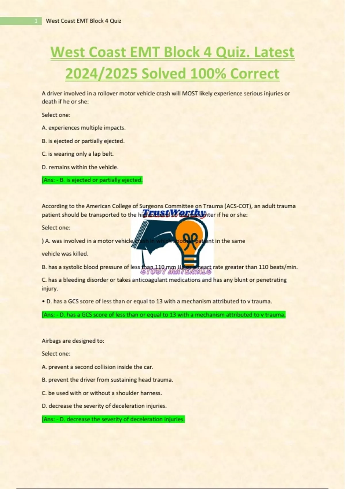 West Coast EMT Block 4 Quiz. Latest 2024/2025 Solved 100% Correct,West Coast EMT Block 4 Quiz. Latest 2024/2025 Solved 100% Correct,West Coast EMT Block 4 Quiz. Latest 2024/2025 Solved 100% Correct