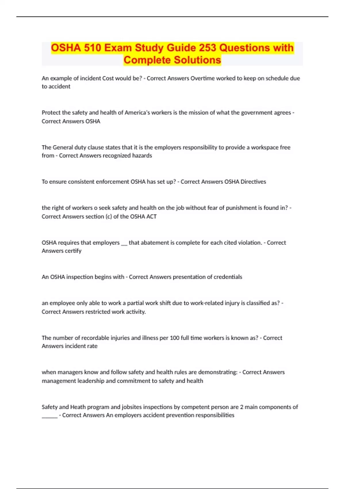 OSHA 510 Exam Study Guide 253 Questions with Complete Solutions An example of incident Cost would be? - Correct Answers Overtime worked to keep on schedule due to accident Protect the safety and health of America's workers is the mission of what the government agrees - Correct Answers OSHA The General duty clause states that it is the employers responsibility to provide a workspace free from - Correct Answers recognized hazards To ensure consistent enforcement OSHA has set up? - Correct Answers OSHA Directives the right of workers o seek safety and health on the job without fear of punishment is found in? - Correct Answers section (c) of the OSHA ACT OSHA requires that employers __ that abatement is complete for each cited violation. - Correct Answers certify An OSHA inspection begins with - Correct Answers presentation of credentials an employee only able to work a partial work shift due to work-related injury is classified as? - Correct Answers restricted work activity. The number of recordable injuries and illness per 100 full time workers is known as? - Correct Answers incident rate when managers know and follow safety and health rules are demonstrating: - Correct Answers management leadership and commitment to safety and health Safety and Heath program and jobsites inspections by competent person are 2 main components of _____ - Correct Answers An employers accident prevention responsibilities 100 ft is the maximum ___ from