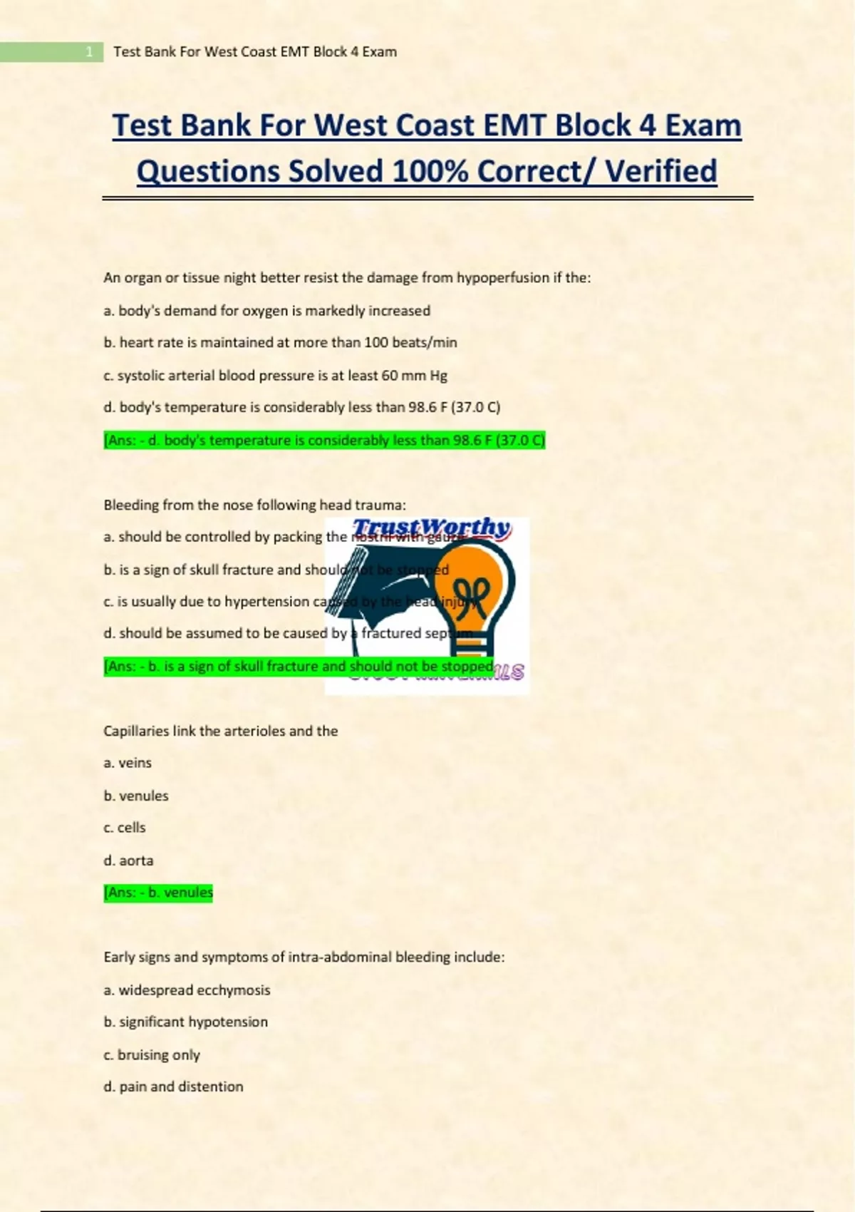 Test Bank For West Coast EMT Block 4 Exam Questions Solved 100% Correct/ Verified