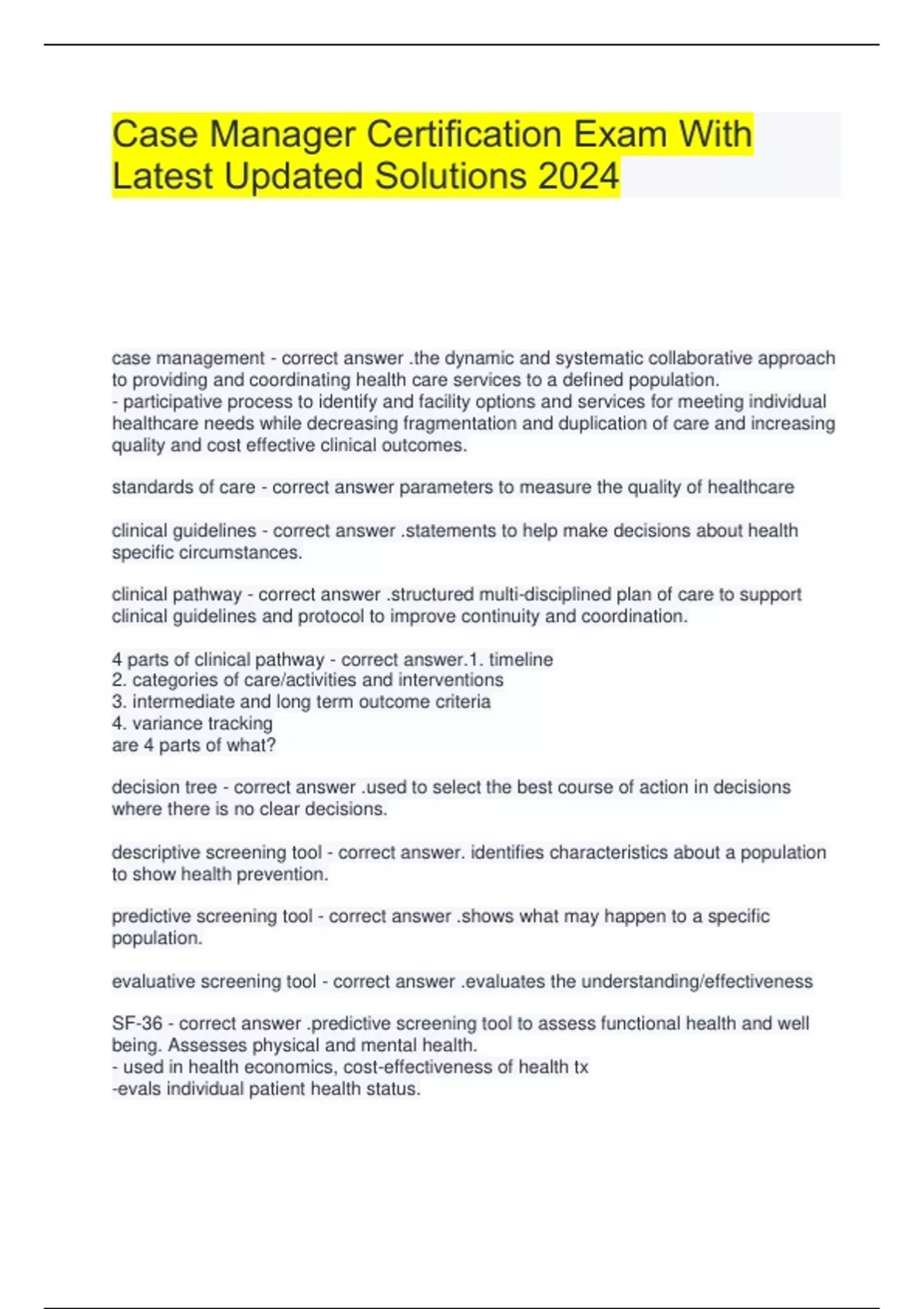 Case Manager Certification Exam With Latest Updated Solutions 2024 case management - correct answer .the dynamic and systematic collaborative approach to providing and coordinating health care services to a defined population. - participative process to identify and facility options and services for meeting individual healthcare needs while decreasing fragmentation and duplication of care and increasing quality and cost effective clinical outcomes. standards of care - correct answer parameters to measure the quality of healthcare clinical guidelines - correct answer .statements to help make decisions about health specific circumstances. clinical pathway - correct answer .structured multi-disciplined plan of care to support clinical guidelines and protocol to improve continuity and coordination. 4 parts of clinical pathway - correct answer.1. timeline 2. categories of care/activities and interventions 3. intermediate and long term outcome criteria 4. variance tracking are 4 parts of what? decision tree - correct answer .used to select the best course of action in decisions where there is no clear decisions. descriptive screening tool - correct answer. identifies characteristics about a population to show health prevention. predictive screening tool - correct answer .shows what may happen to a specific population. evaluative screening tool - correct answer .evaluates the understanding/effectiveness SF-36 - correct answer .predictive screening tool to assess functional health and well being. Assesses physical and mental health. - used in health economics, cost-effectiveness of health tx -evals individual patient health status. - does not consider sleep -scored 00-100, lower score-> incr. disability patient activation measure - correct answer.13 item predictive screening tool to evaluate patient's knowledge, skills, confidence in self-care. - higher the score the better (scored 0-52) -predicts health care outcomes, medication adherence and ER visits. health risk assessment - correct ctive screening tool: patient's self assessment of their health and how likely they will seek care. - predicts future health costs - predicts likely-hood of progression of their illness to a worse condition. - examples: PHQ-9, etc. rose Q - correct h risk assessment for angina, MI, coronary heart disease. defined angina pectoris as, "a chest pain or discomfort with these characteristics: (a) the site must include either the sternum (any level) or the left arm and left anterior chest (defined as the anterior chest wall between the levels of clavicle and lower end of sternum), (b) it must be provoked by either hurrying or walking uphill (or by walking on the level, for those who never attempt more), (c) when it occurs on walking it must make the subject either stop or slacken pace, unless nitroglycerin is taken, (d) it must disappear on a majority of occasions in 10 min or less from the time when the subject stands still." Possible myocardial infarction1 was defined as, "one or more attacks of severe pain across the front of the chest lasting for 30 min or longer." seattle angina questionnaire - correct answer.19-item self-administered health risk assessment for angina and functional artery disease measuring five dimensions of coronary artery disease: 1 physical limitation, 2 anginal stability, 3 anginal frequency, 4 treatment satisfaction and 5 disease perception. -score of 0 to 100, where higher scores indicate better function (eg, less physical
