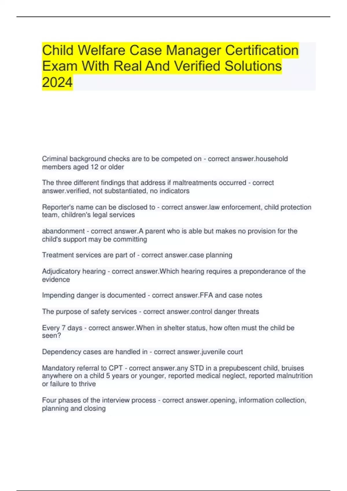 Child Welfare Case Manager Certification Exam With Real And Verified Solutions 2024 Criminal background checks are to be competed on - correct hold members aged 12 or older The three different findings that address if maltreatments occurred - correct ied, not substantiated, no indicators Reporter's name can be disclosed to - correct enforcement, child protection team, children's legal services abandonment - correct answer.A parent who is able but makes no provision for the child's support may be committing Treatment services are part of - correct planning Adjudicatory hearing - correct answer.Which hearing requires a preponderance of the evidence Impending danger is documented - correct answer.FFA and case notes The purpose of safety services - correct ol danger threats Every 7 days - correct answer.When in shelter status, how often must the child be seen? Dependency cases are handled in - correct ile court Mandatory referral to CPT - correct STD in a prepubescent child, bruises anywhere on a child 5 years or younger, reported medical neglect, reported malnutrition or failure to thrive Four phases of the interview process - correct ng, information collection, planning and closing 14 days - correct answer.After developing a present danger safety plan, when should the FFA be completed? 48 hours - correct answer.How long to complete a present danger assessment? What is the purpose of the Uniform Child Custody Jurisdiction and Enforcement Act (UCCJEA)? - correct answer.Establish jurisdiction Chapter 39 protects children from - correct itation, abuse, neglect and abandonment Adjudicatory - correct answer.Hearing where parents can offer testimony Three types of petitions that can be filed in court - correct answer.Dependency, shelter, and TPR