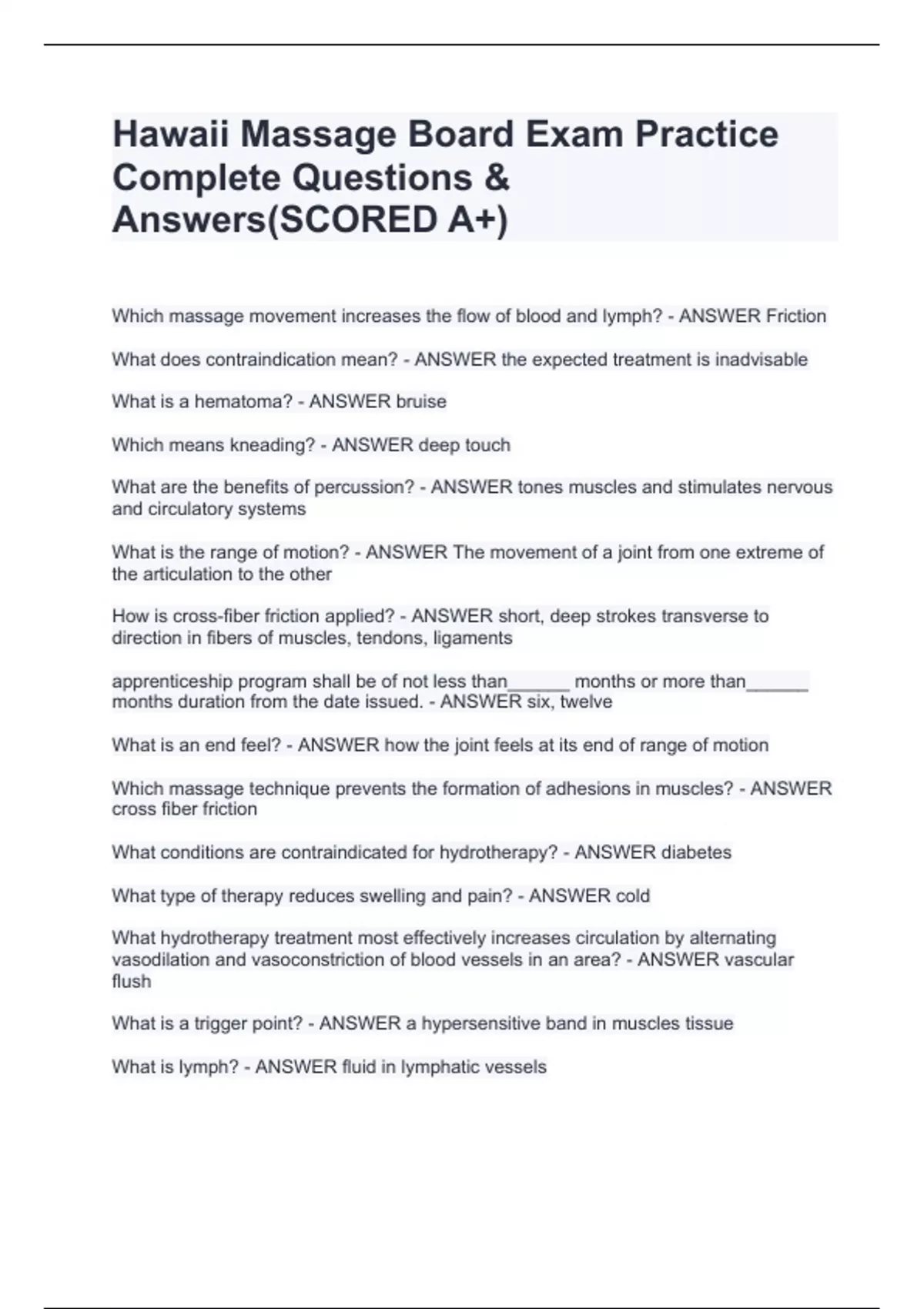 Hawaii Massage Board Exam Practice Complete Questions & Answers(SCORED A+) Which massage movement increases the flow of blood and lymph? - ANSWER Friction What does contraindication mean? - ANSWER the expected treatment is inadvisable What is a hematoma? - ANSWER bruise Which means kneading? - ANSWER deep touch What are the benefits of percussion? - ANSWER tones muscles and stimulates nervous and circulatory systems What is the range of motion? - ANSWER The movement of a joint from one extreme of the articulation to the other How is cross-fiber friction applied? - ANSWER short, deep strokes transverse to direction in fibers of muscles, tendons, ligaments apprenticeship program shall be of not less than______ months or more than______ months duration from the date issued. - ANSWER six, twelve What is an end feel? - ANSWER how the joint feels at its end of range of motion Which massage technique prevents the formation of adhesions in muscles? - ANSWER cross fiber friction What conditions are contraindicated for hydrotherapy? - ANSWER diabetes What type of therapy reduces swelling and pain? - ANSWER cold What hydrotherapy treatment most effectively increases circulation by alternating vasodilation and vasoconstriction of blood vessels in an area? - ANSWER vascular flush What is a trigger point? - ANSWER a hypersensitive band in muscles tissue What is lymph? - ANSWER fluid in lymphatic vessels
