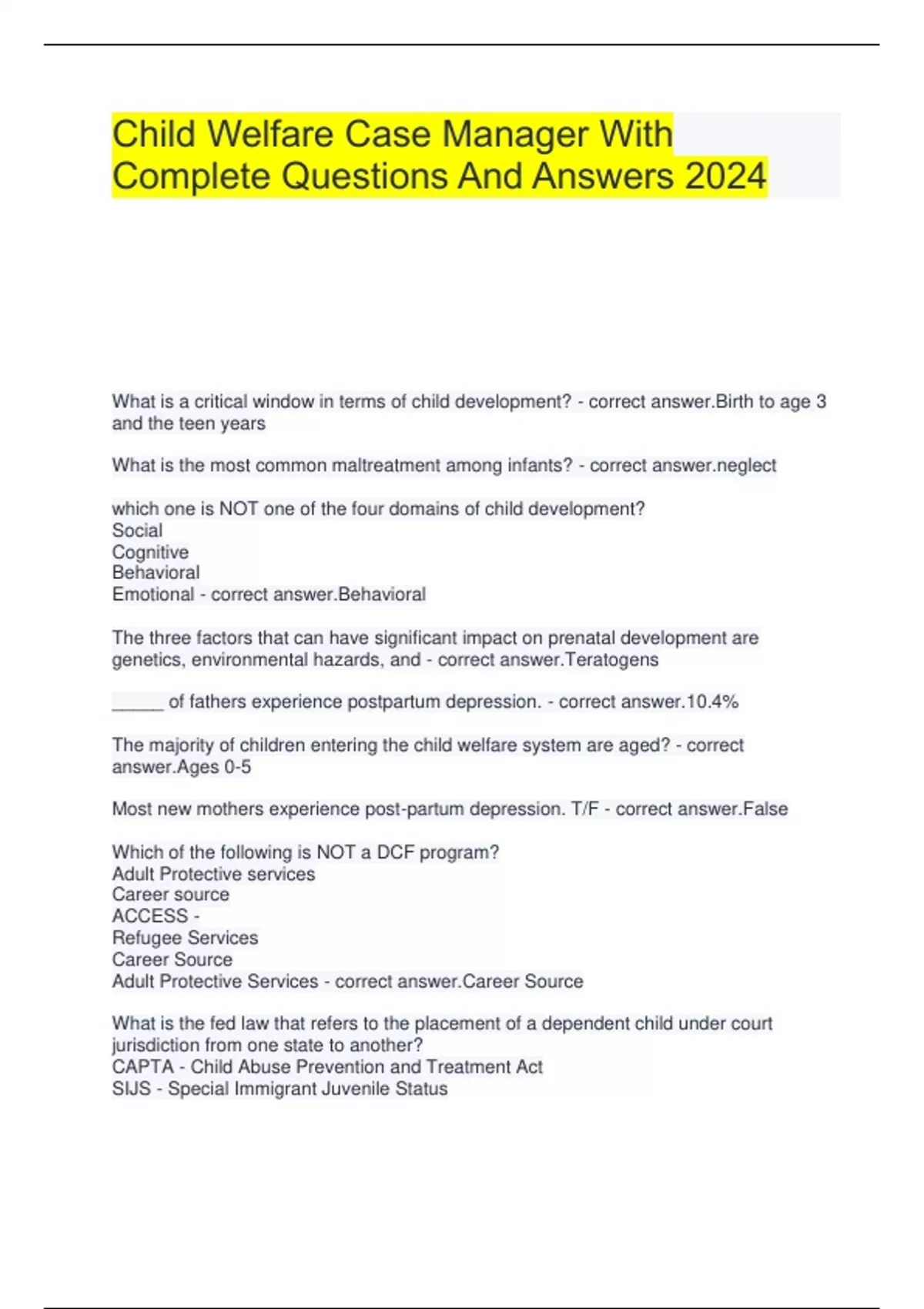 Child Welfare Case Manager With Complete Questions And Answers 2024 What is a critical window in terms of child development? - correct answer.Birth to age 3 and the teen years What is the most common maltreatment among infants? - correct ct which one is NOT one of the four domains of child development? Social Cognitive Behavioral Emotional - correct answer.Behavioral The three factors that can have significant impact on prenatal development are genetics, environmental hazards, and - correct answer.Teratogens _____ of fathers experience postpartum depression. - correct answer.10.4% The majority of children entering the child welfare system are aged? - correct answer.Ages 0-5 Most new mothers experience post-partum depression. T/F - correct answer.False Which of the following is NOT a DCF program? Adult Protective services Career source ACCESS - Refugee Services Career Source Adult Protective Services - correct answer.Career Source What is the fed law that refers to the placement of a dependent child under court jurisdiction from one state to another? CAPTA - Child Abuse Prevention and Treatment Act SIJS - Special Immigrant Juvenile Status ICPC - Interstate Compact for the Placement of Children ICWA - Indian Child Welfare Act - correct answer.ICPC - Interstate Compact for the Placement of Children What are CBC Programs? -Case management, foster care, adoptions - Food bank, community church, shelter - IFST, ACCESS, HEADS -Public library schools, sunshine Medicaid - correct answer.Case management, foster care, adoptions The ________________ is the origin of the foster care system. - correct n train fifty percent of our budget is federal funding? True False - correct answer.True A battered child has a clinical condition from serious physical abuse that causing permanent injury or death. -True -False - correct _________________ is a guarantee that all legal proceedings will be fair and one will be given notice of all proceedings. - Most restrictive -Due process -Reasonable efforts -None of the above - correct answer.Due process What means to provide the least interference with family unity and privacy while still assuring child safety? - Due process -Least restrictive -Reasonable efforts -All of the above - correct answer.Least restrictive What must a child welfare professional do before the removal of a child? - Reasonable efforts to prevent removal - Wear a mask and wash your hands - Interview the child - All of the above - correct answer.Reasonable efforts to prevent removal This ensures the children get resolution to their need for safety and a permanent family with whom they can reside. - Reasonable efforts