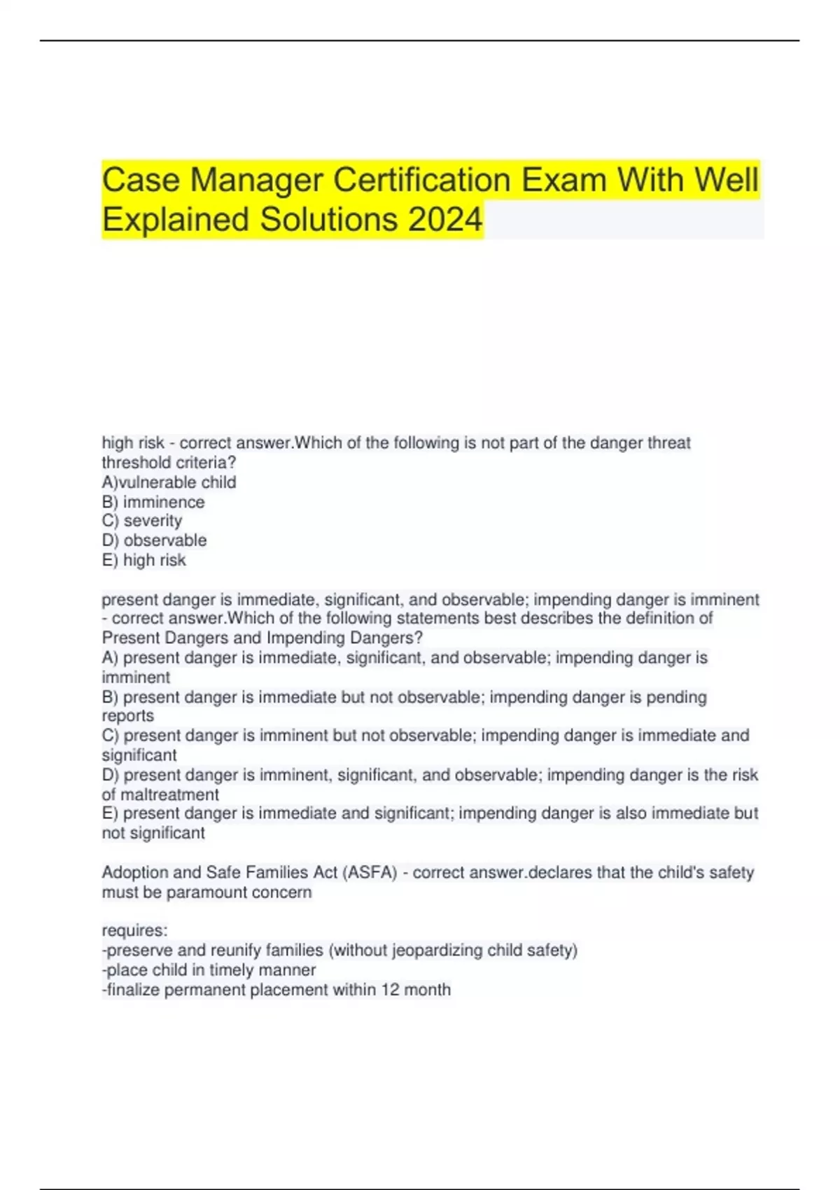 Case Manager Certification Exam With Well Explained Solutions 2024 high risk - correct answer.Which of the following is not part of the danger threat threshold criteria? A)vulnerable child B) imminence C) severity D) observable E) high risk present danger is immediate, significant, and observable; impending danger is imminent - correct answer.Which of the following statements best describes the definition of Present Dangers and Impending Dangers? A) present danger is immediate, significant, and observable; impending danger is imminent B) present danger is immediate but not observable; impending danger is pending reports C) present danger is imminent but not observable; impending danger is immediate and significant D) present danger is imminent, significant, and observable; impending danger is the risk of maltreatment E) present danger is immediate and significant; impending danger is also immediate but not significant Adoption and Safe Families Act (ASFA) - correct res that the child's safety must be paramount concern requires: -preserve and reunify families (without jeopardizing child safety) -place child in timely manner -finalize permanent placement within 12 month