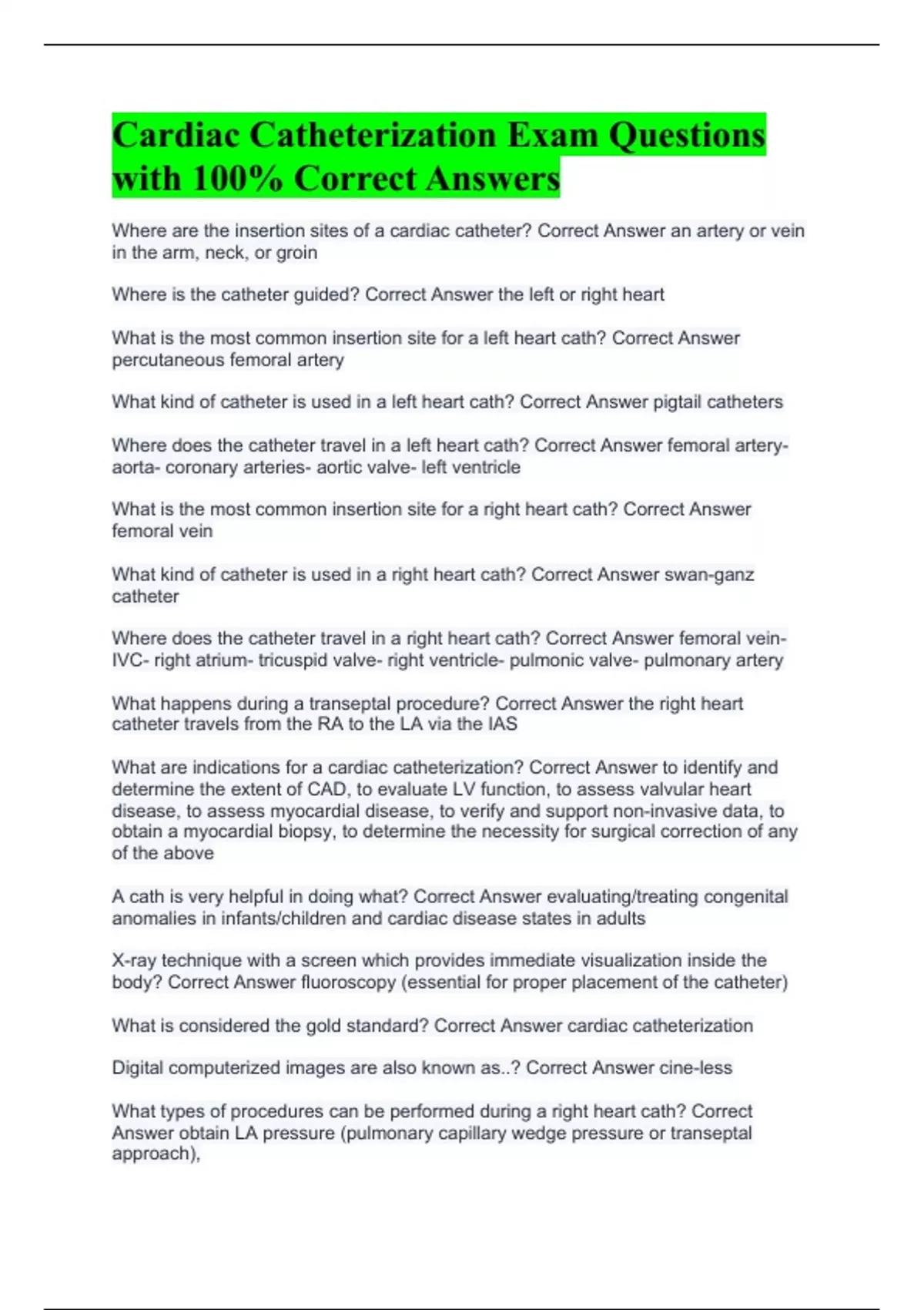 Cardiac Catheterization Exam Questions with 100% Correct Answers