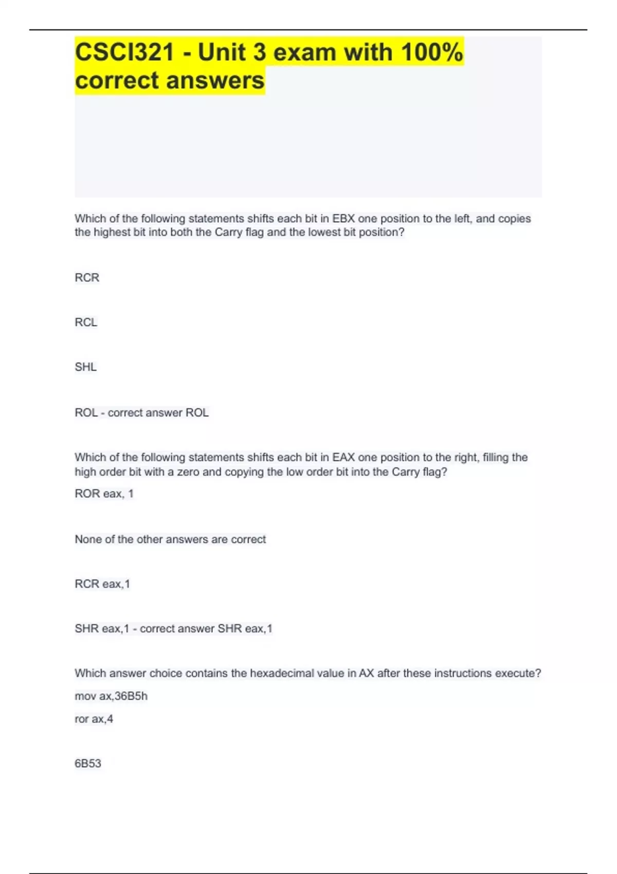 Which of the following statements shifts each bit in EBX one position to the left, and copies the highest bit into both the Carry flag and the lowest bit position? RCR RCL SHL ROL - correct answer ROL Which of the following statements shifts each bit in EAX one position to the right, filling the high order bit with a zero and copying the low order bit into the Carry flag? ROR eax, 1 None of the other answers are correct RCR eax,1 SHR eax,1 - correct answer SHR eax,1 Which answer choice contains the hexadecimal value in AX after these instructions execute? mov ax,36B5h ror ax,4 6B53 B536 563B 536B - correct answer 536B Which answer choice contains the hexadecimal value in AX after these instructions execute? mov ax,36B5h shr ax,3 0C2B 07D7 0A6B 06D6 - correct answer 06D6 Which instruction performs the following operation, where CF denotes the Carry flag? Before: CF,AL = After: CF,AL = RCR ROL ROR RCL - correct answer RCL Which answer choice contains the hexadecimal value in AX after these instructions execute? mov ax,36B5h shl ax,3 D5B4 D6A2 B6A4 B5A8 - correct answer B5A8 Which answer choice contains the hexadecimal value in AX after these instructions execute? mov ax,36B5h ror ax,3 0AB6 0D6B A6D6 AD6B - correct answer A6D6 Suppose you wish to write assembly language instructions that multiply EAX by 24 using binary multiplication. Which of the following code sequences would accomplish this task? mov ebx,eax shl eax,5 shl ebx,2 add eax,ebx mov ebx,eax shl eax,4 shl ebx,3 add eax,ebx mov ebx,eax shr eax,4 shr ebx,3 add eax,ebx mov ebx,eax shl eax,4 shl ebx,1 add eax,ebx - correct answer mov ebx,eax shl eax,4 shl ebx,3 add eax,ebx Suppose you wish to assembly language instructions that multiply EAX by 21 using binary multiplication. If we express the value as (EAX * 16) + (EAX * 4) + EAX, the following code is missing two lines: mov ebx,eax mov ecx,eax shl eax,4 __________________ __________________ add eax,ecx Which of the following choices correctly supplies the missing lines? shl ebx,3 add eax,eax shl ebx,4 add ebx,eax shl ebx,4 add eax,ebx shl ebx,2 add eax,ebx - correct answer shl ebx,2 add eax,ebx Suppose the time stamp field of a file directory entry uses bits 0 through 4 for the seconds, bits 5 through 10 for the minutes, and bits 11 through 15 for the hours. Assuming DX already contains time stamp data, which of the following instruction sequences correctly extracts the minutes and copies the value to a byte variable named bMinutes? Sequence : shr dx,5 and dl,b mov bMinutes,dl Sequence : shr dx,4 and dl,b mov bMinutes,dl Sequence : shr dx,4 or dl,b mov bMinutes,dl Sequence : shr dx,5 and dl,b mov bMinutes,dl - correct answer Sequence : shr dx,5 and dl,b mov bMinutes,dl Overflow can occur when the MUL and one-operand IMUL instructions execute. true false - correct answer false //overflow cannot occur when MUL executes When the product fits completely within the lower register of the product, IMUL sign-extends the product into the upper product register. MUL, on the other hand, zero-extends the product. true false - correct answer true When the IMUL instruction executes, the Carry and Overflow flags are set only when the upper half of the product is not a sign extension of the lower half of the product. true false - correct answer true When EBX is the operand in a DIV instruction, which register (or combination of registers) holds the quotient? EDX:EAX EDX EAX AX - correct answer EAX When BX is the operand in a DIV instruction, which register holds the quotient? AX EAX DX AL - correct answer AX When BL is the operand in a MUL instruction, which registers hold the product? DX:AX EAX AX EDX - correct answer AX What is the final decimal value in AX when this code executes? .data dividend WORD -5678 divisor WORD 10 .code mov ax,dividend cwd mov bx,divisor idiv bx −678 -567 567 +567 - correct answer −567 The ADC instruction adds both a source operand and the Carry flag to a destination operand. true false - correct answer true The SBB instruction subtracts both a source operand and the Carry flag from a destination operand. true false - correct answer true What will be the values of EDX and EAX after the following instructions execute? mov edx,10h mov eax,0A0000000h add eax,h adc edx,0 EAX = h, EDX = h EAX = C0000000h, EDX = h EAX = 1C0000000h, EDX = h EAX = C0000000h, EDX = h - correct answer EAX = C0000000h, EDX = h What will be the values of EDX and EAX after the following instructions execute? mov edx,100h mov eax,h sub eax,h sbb edx,0 EAX = h, EDX = 100000FFh EAX = F0000000h, EDX = 000000FFh EAX = h, EDX = F00000FFh EAX = F0000001h, EDX = 000000F0h - correct answer EAX = F0000000h, EDX = 000000FFh What will be the contents of DX after the following instructions execute? (Note: STC sets the Carry flag.) mov dx,5 stc mov ax,10h adc dx,ax DX = 0015h DX = 0115h DX = 0160h DX = 0016h - correct answer DX = 0016h Which of the following instructions converts a two-digit unpacked decimal integer in AX to ASCII decimal? or ax,0F0F0h and ax,0F0Fh or ax,3030h or ax,3000h - correct answer or ax,3030h Which of the following instructions converts a two-digit ASCII decimal integer in AX to unpacked decimal format? xor ax,3030h or ax,0303h and ax,0F0Fh and ax,0F0F0h - correct answer and ax,0F0Fh Which of the following is a two-instruction sequence that converts a two-digit ASCII decimal number in AX to binary? or ax,0303h aad or ax,3030h aad and ax,0F0Fh aad or ax,0F0Fh aad - correct answer and ax,0F0Fh aad Which of the following instructions converts an unsigned binary integer in AX to unpacked decimal? aam aaa aas aad - correct answer aam The DAA instruction sets the Carry flag when the sum of a packed decimal addition is greater than 99. true false - correct answer true The DAS instruction sets the Carry flag when a smaller packed decimal integer is subtracted from a larger one. true false - correct answer false When adding two packed decimal integers of length n bytes, how many storage bytes