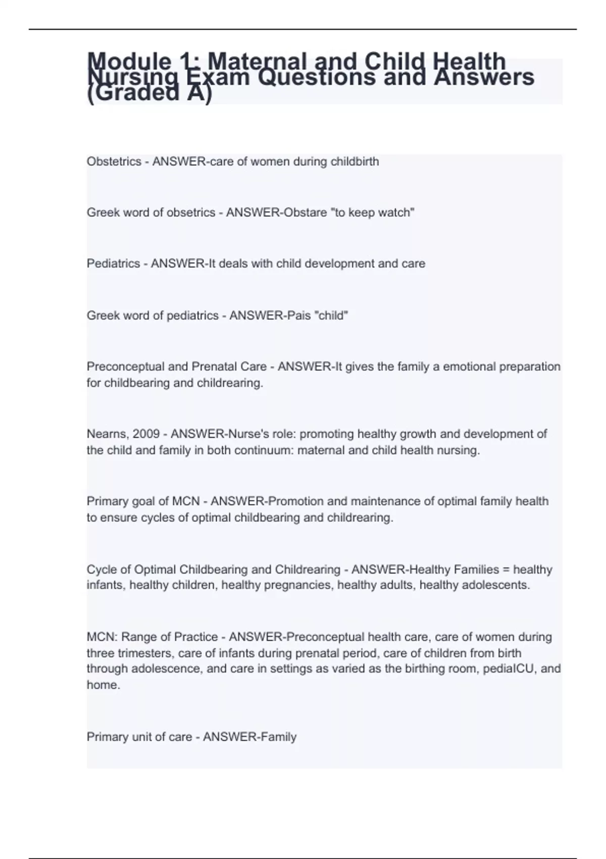 Greek word of obsetrics - ANSWER-Obstare "to keep watch" Pediatrics - ANSWER-It deals with child development and care Greek word of pediatrics - ANSWER-Pais "child" Preconceptual and Prenatal Care - ANSWER-It gives the family a emotional preparation for childbearing and childrearing. Nearns, 2009 - ANSWER-Nurse's role: promoting healthy growth and development of the child and family in both continuum: maternal and child health nursing. Primary goal of MCN - ANSWER-Promotion and maintenance of optimal family health to ensure cycles of optimal childbearing and childrearing. Cycle of Optimal Childbearing and Childrearing - ANSWER-Healthy Families = healthy infants, healthy children, healthy pregnancies, healthy adults, healthy adolescents. MCN: Range of Practice - ANSWER-Preconceptual health care, care of women during three trimesters, care of infants during prenatal period, care of children from birth through adolescence, and care in settings as varied as the birthing room, pediaICU, and home. Primary unit of care - ANSWER-Family Vonderheid, Norr, & Handler, 2007 - ANSWER-Level of family's functioning affects the health status of its members.