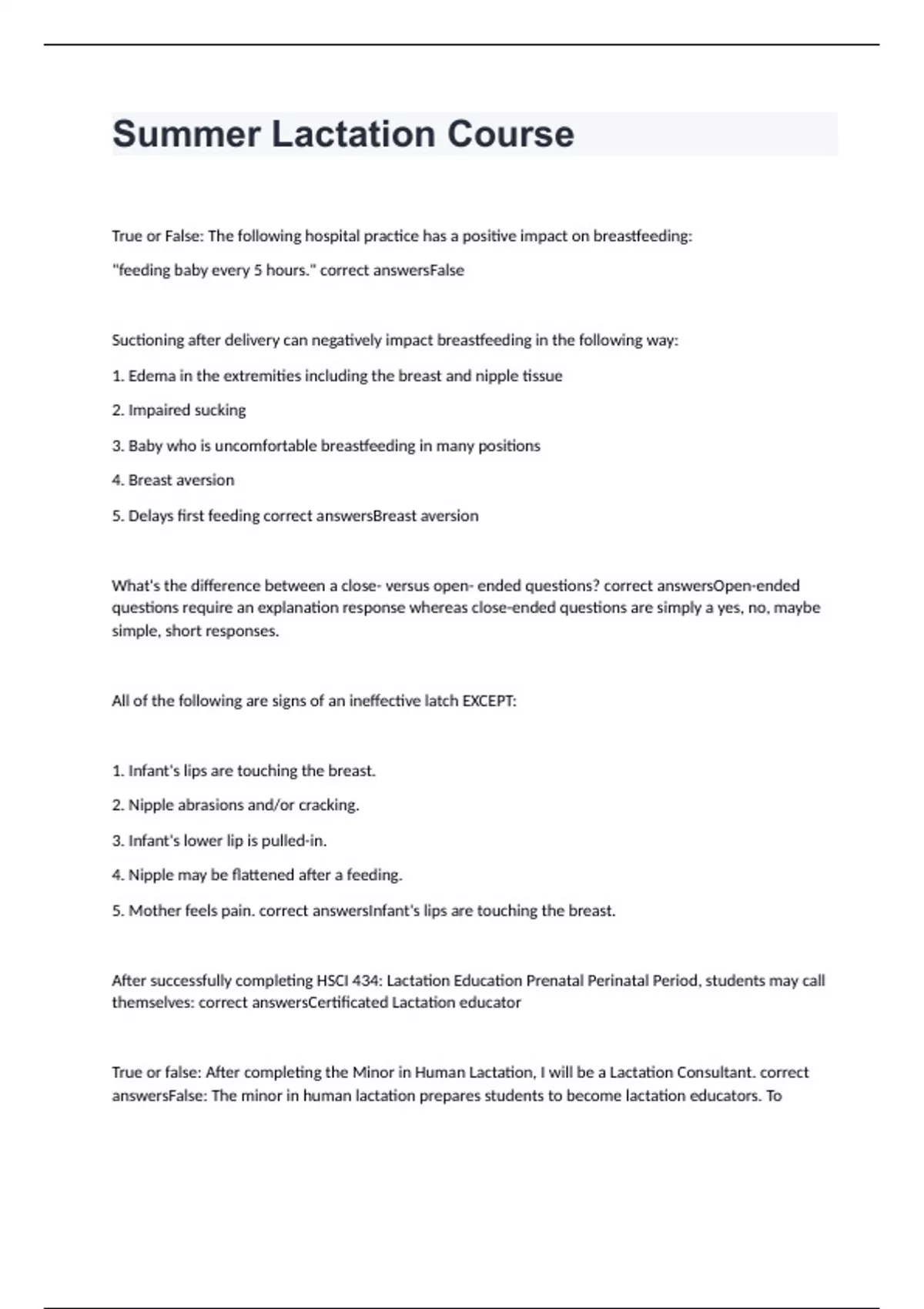 True or False: The following hospital practice has a positive impact on breastfeeding: "feeding baby every 5 hours." correct answersFalse Suctioning after delivery can negatively impact breastfeeding in the following way: 1. Edema in the extremities including the breast and nipple tissue 2. Impaired sucking 3. Baby who is uncomfortable breastfeeding in many positions 4. Breast aversion 5. Delays first feeding correct answersBreast aversion What's the difference between a close- versus open- ended questions? correct answersOpen-ended questions require an explanation response whereas close-ended questions are simply a yes, no, maybe simple, short responses. All of the following are signs of an ineffective latch EXCEPT: 1. Infant's lips are touching the breast. 2. Nipple abrasions and/or cracking. 3. Infant's lower lip is pulled-in. 4. Nipple may be flattened after a feeding. 5. Mother feels pain. correct answersInfant's lips are touching the breast. After successfully completing HSCI 434: Lactation Education Prenatal Perinatal Period, students may call themselves: correct answersCertificated Lactation educator True or false: After completing the Minor in Human Lactation, I will be a Lactation Consultant. correct answersFalse: The minor in human lactation prepares students to become lactation educators. To
