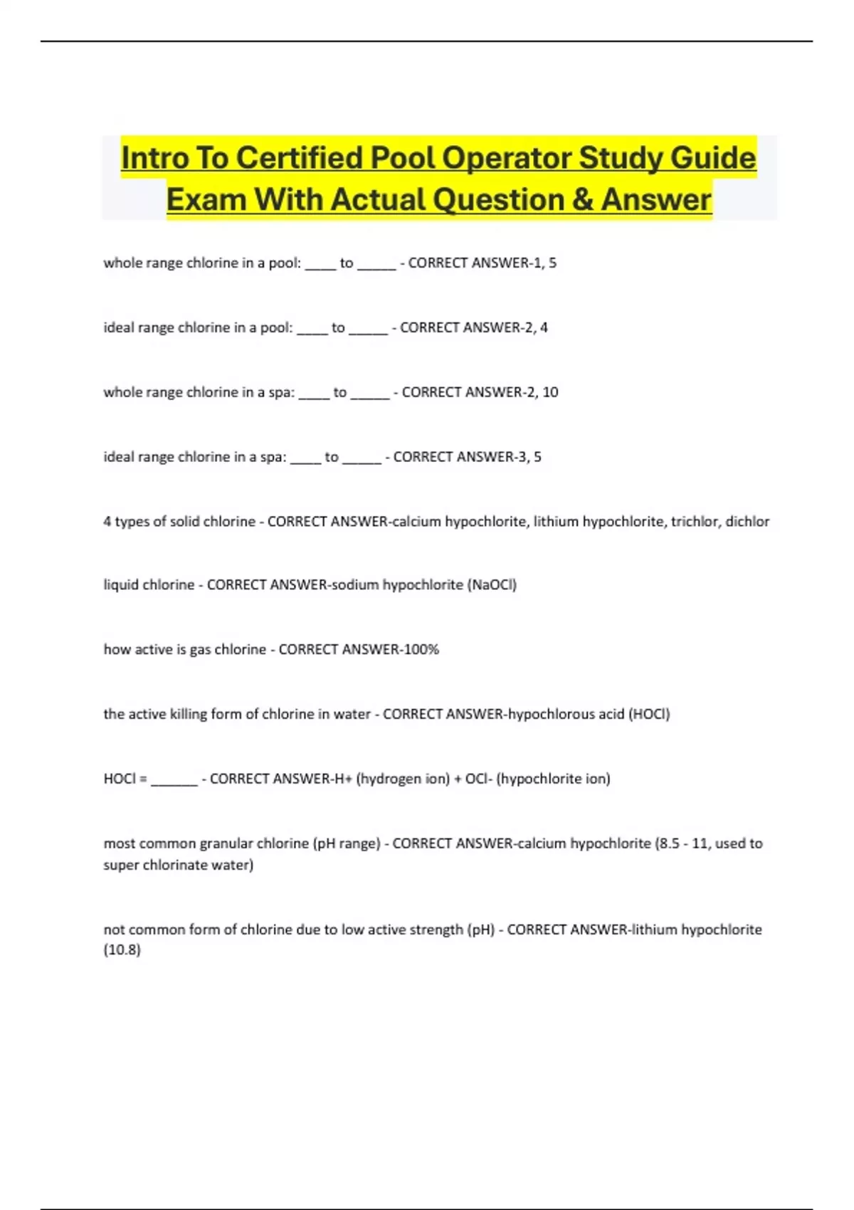 Intro To Certified Pool Operator Study Guide Exam With Actual Question & Answer whole range chlorine in a pool: ____ to _____ - CORRECT ANSWER-1, 5 ideal range chlorine in a pool: ____ to _____ - CORRECT ANSWER-2, 4 whole range chlorine in a spa: ____ to _____ - CORRECT ANSWER-2, 1