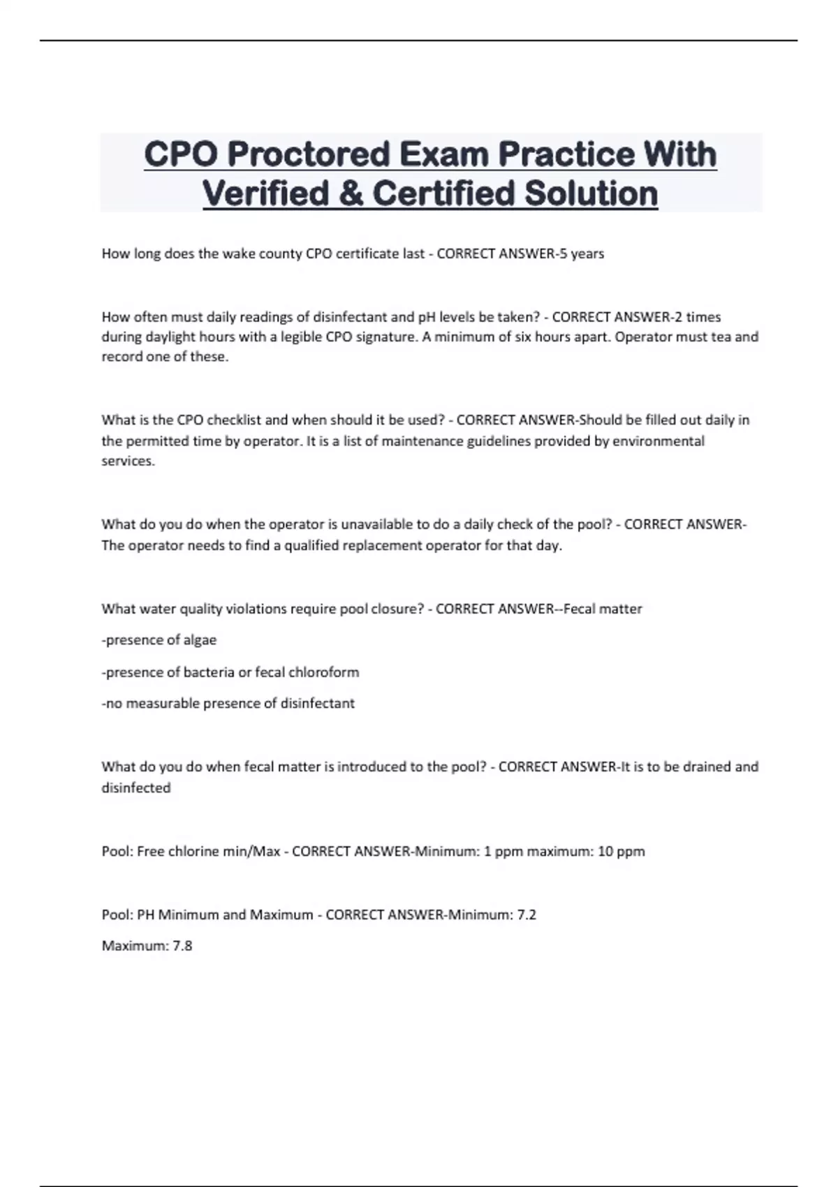 CPO Proctored Exam Practice With Verified & Certified Solution How long does the wake county CPO certificate last - CORRECT ANSWER-5 years How often must daily readings of disinfectant and pH levels be taken? - CORRECT ANSWER-2 times during daylight hours with a legible CPO signature. A minimum of six hours apart. Operator must tea and record one of these. What is the CPO checklist and when should it be used? - CORRECT ANSWER-Should be filled out daily in the permitted time by operator. It is a list of maintenance guidelines provided by environmental services